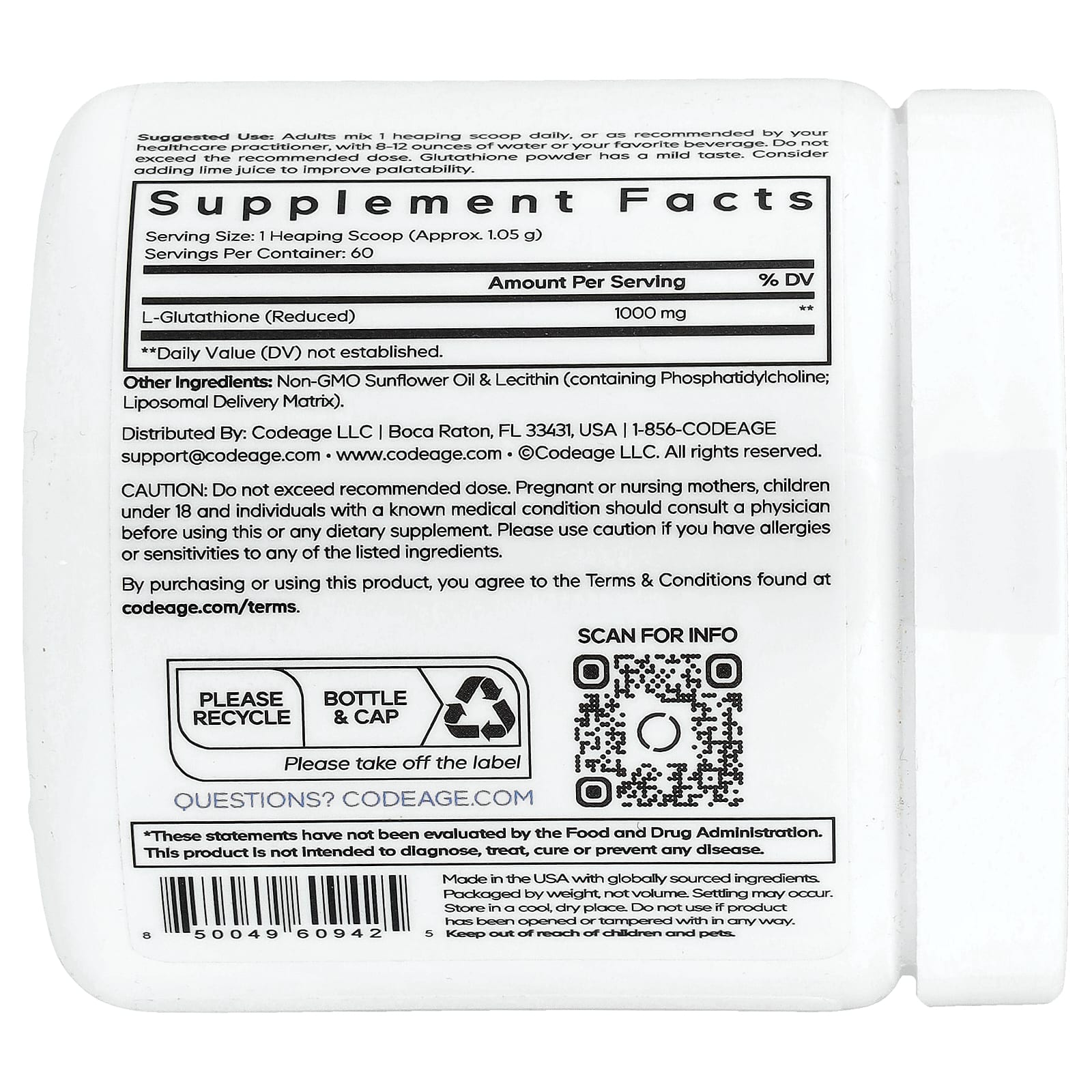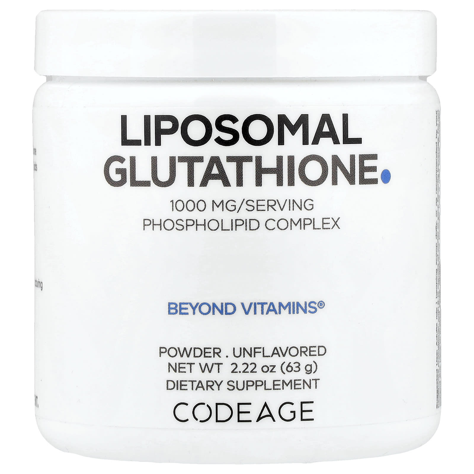 Липосомальный глутатион в порошке Codeage — это усовершенствованная добавка, которая содержит 1000 мг порошка восстановленного L-глутатиона на порцию в запатентованной смеси. Эта добавка в виде порошка также включает фосфолипидный комплекс в качестве липосомальной системы доставки. Упаковки хватает на 2 месяца.