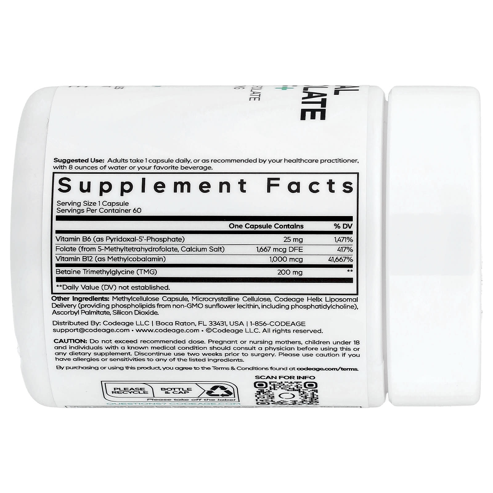 Липосомальный L-метилфолат 5-MTHF+ CodeAge содержит L-метилфолат (витамин B9) и метилкобаламин (B12) в их активной форме, а также пиридоксаль 5'-фосфат (B6), усиленный с помощью TMG и запатентованной CodeAge липосомальной доставки Helix.