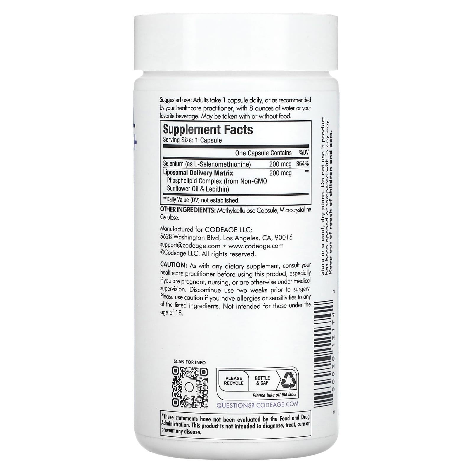 Липосомальный селен+ от Codeage предлагает современную смесь, содержащую 200 мкг L-селенометионина в 1 порции в фосфолипидной матрице из подсолнечного масла без ГМО, а также лецитин, который способствует усвоению. Как универсальный микроэлемент, селен поддерживает ряд функций организма.
