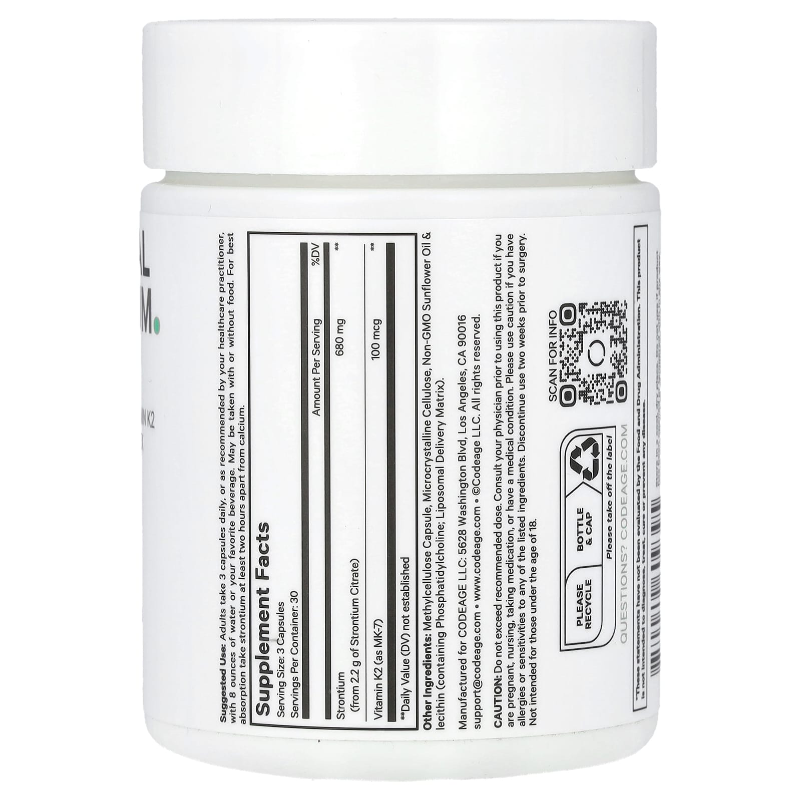 Добавка с липосомальным стронцией Codeage содержит стронций, полученный из цитрата стронция — формы, известной своей биодоступностью, которая помогает поддерживать здоровье костей.