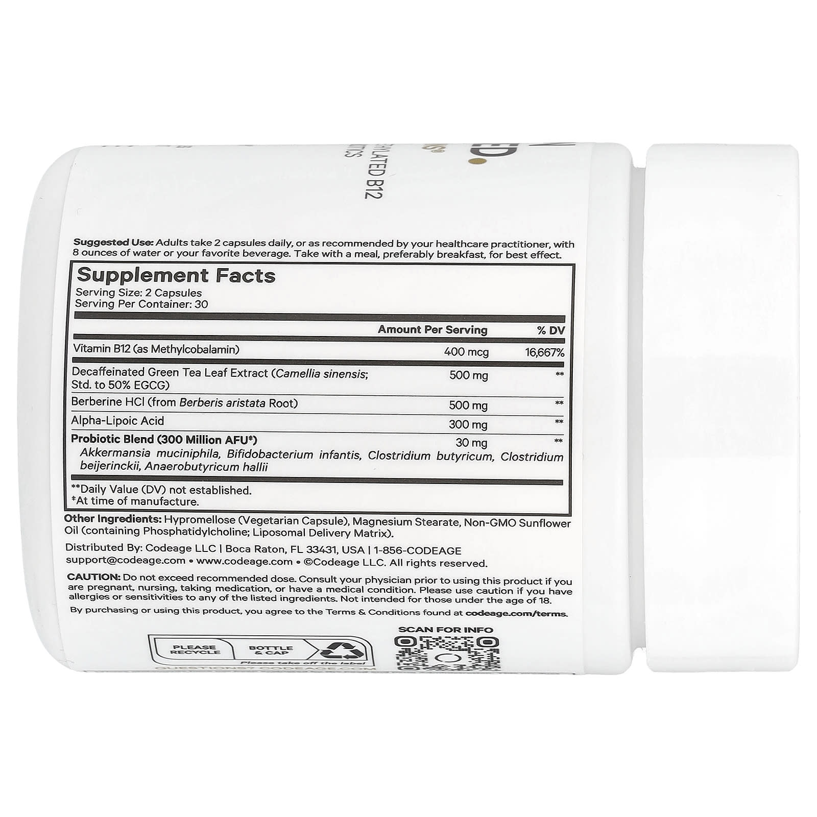 Добавка Codeage M-Burn Optimized содержит целевую смесь экстракта зеленого чая без кофеина, стандартизированного до 50% EGCG, берберина гидрохлорида, альфа-липоевой кислоты, витамина B12 (в виде метилкобаламина) и смесь пробиотиков, включая Akkermansia muciniphila.