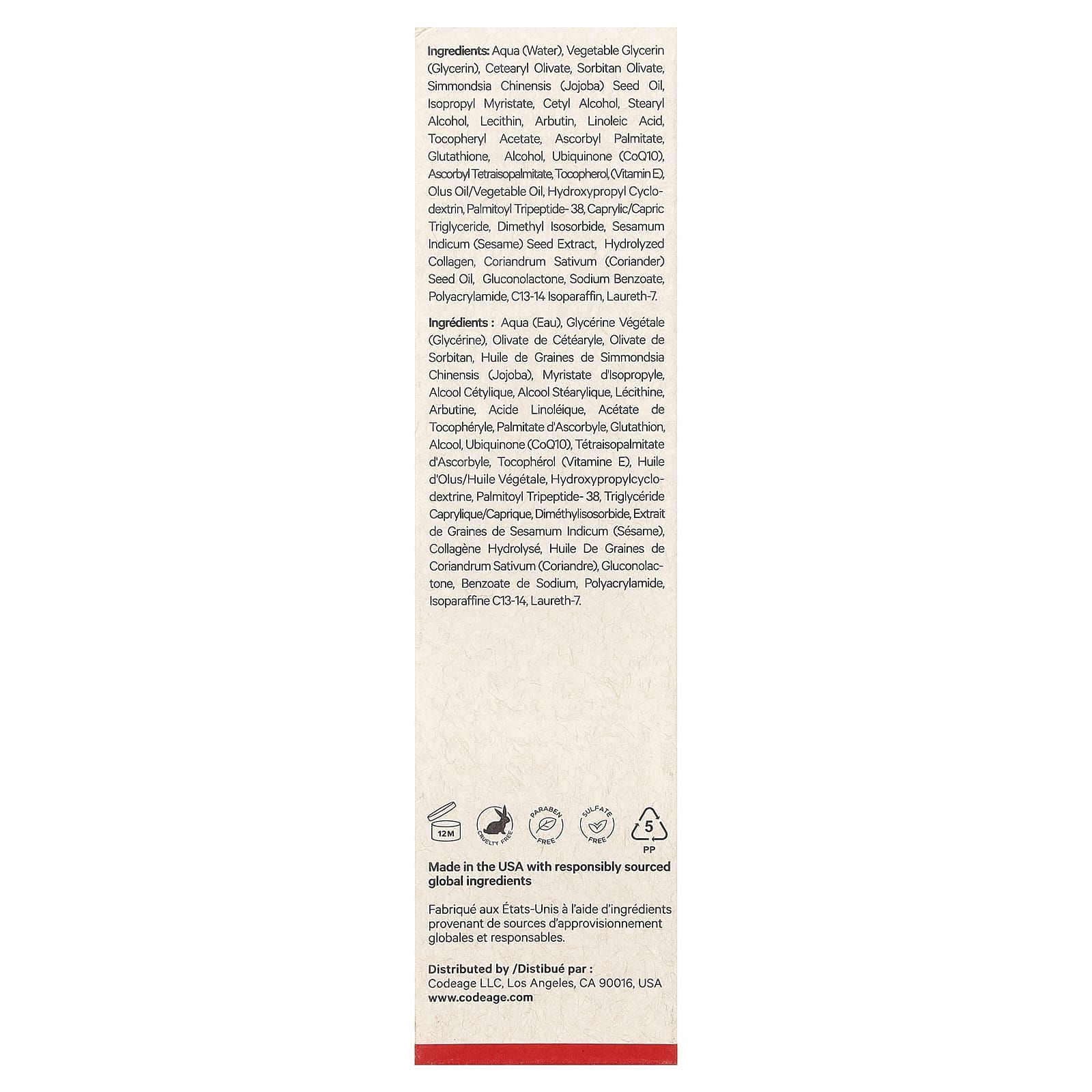 Вода (Aqua), растительный глицерин (глицерин), цетеарил оливат, сорбитан оливат, масло из семян жожоба (Simmondsia chinensis), изопропил миристат, цетиловый спирт, стеариловый спирт, лецитин, арбутин, линолевая кислота, токоферилацетат, аскорбил пальмитат., глутатион, спирт, убихинон (коэнзим Q10), аскорбил тетраизопальмитат, токоферол, (витамин E), оливковое масло/растительное масло, гидроксипропил циклодекстрин, пальмитоил трипептид-38, каприловый/каприновый триглицерид, диметил изосорбид, экстракт семян кунжута (Sesamum indicum), гидролизованный коллаген, масло из семян кориандра (Coriandrum sativum), глюконолактон, бензоат натрия, полиакриламид, c13-14 изопарафин, лаурет-7.