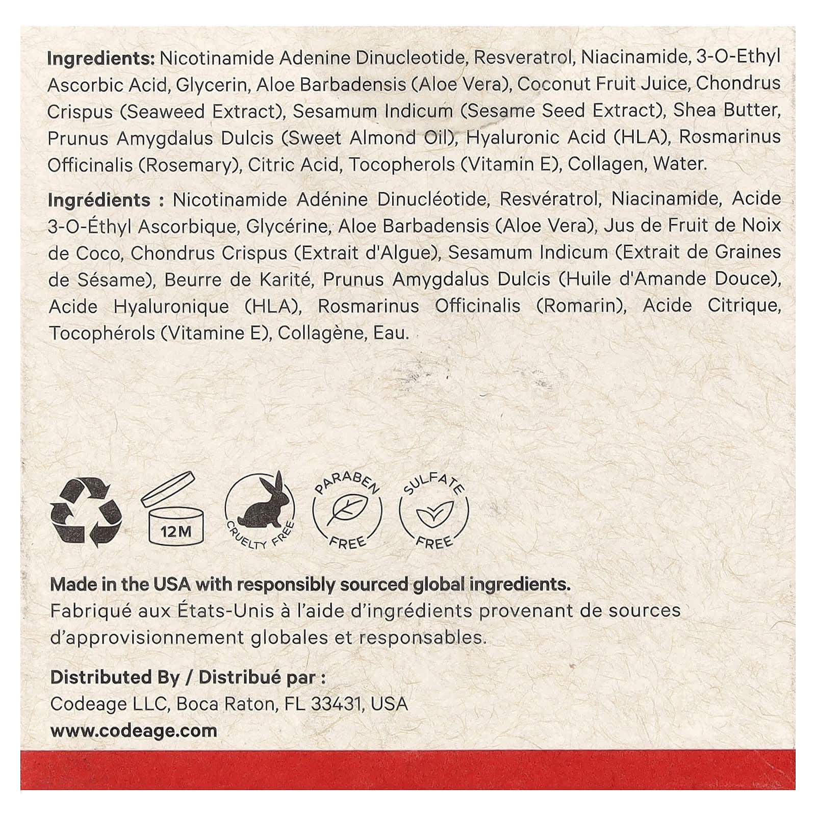 Никотинамид аденин динуклеотид, ресвератрол, никотинамид, 3-о-этил-аскорбиновая кислота, глицерин, алоэ вера (Aloe barbadensis), кокосовый сок, ирландский мох (Chondrus crispus) (экстракт морской водоросли), экстракт семян кунжута (Sesamum indicum), масло ши, масло сладкого миндаля (Prunus amygdalus dulcis), гиалуроновая кислота (ГЛК), розмарин (Rosmarinus officinalis), лимонная кислота, токоферолы (витамин E), коллаген, вода.
