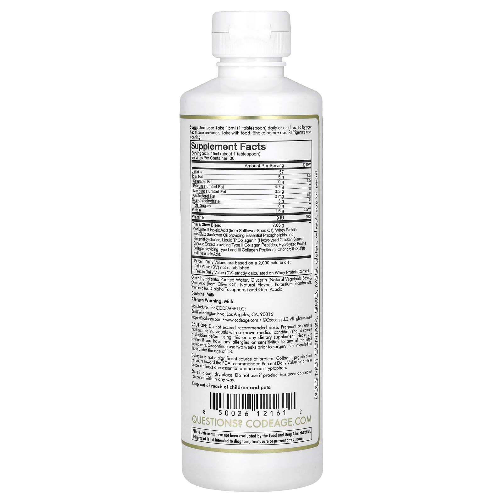 | Смесь Trim & Glow Конъюгированная линолевая кислота (из масла семян сафлора), сывороточный протеин, подсолнечное масло без ГМО, содержащее незаменимые фосфолипиды и фосфатидилхолин, жидкий TriCollagen ™ (гидролизованный экстракт куриного грудного хряща, содержащий пептиды коллагена типа II, гидролизованный бычий коллаген, обеспечивающий пептиды коллагена типа I и III) , Хондроитинсульфат и гиалуроновая кислота. | 7,06 г | ** |