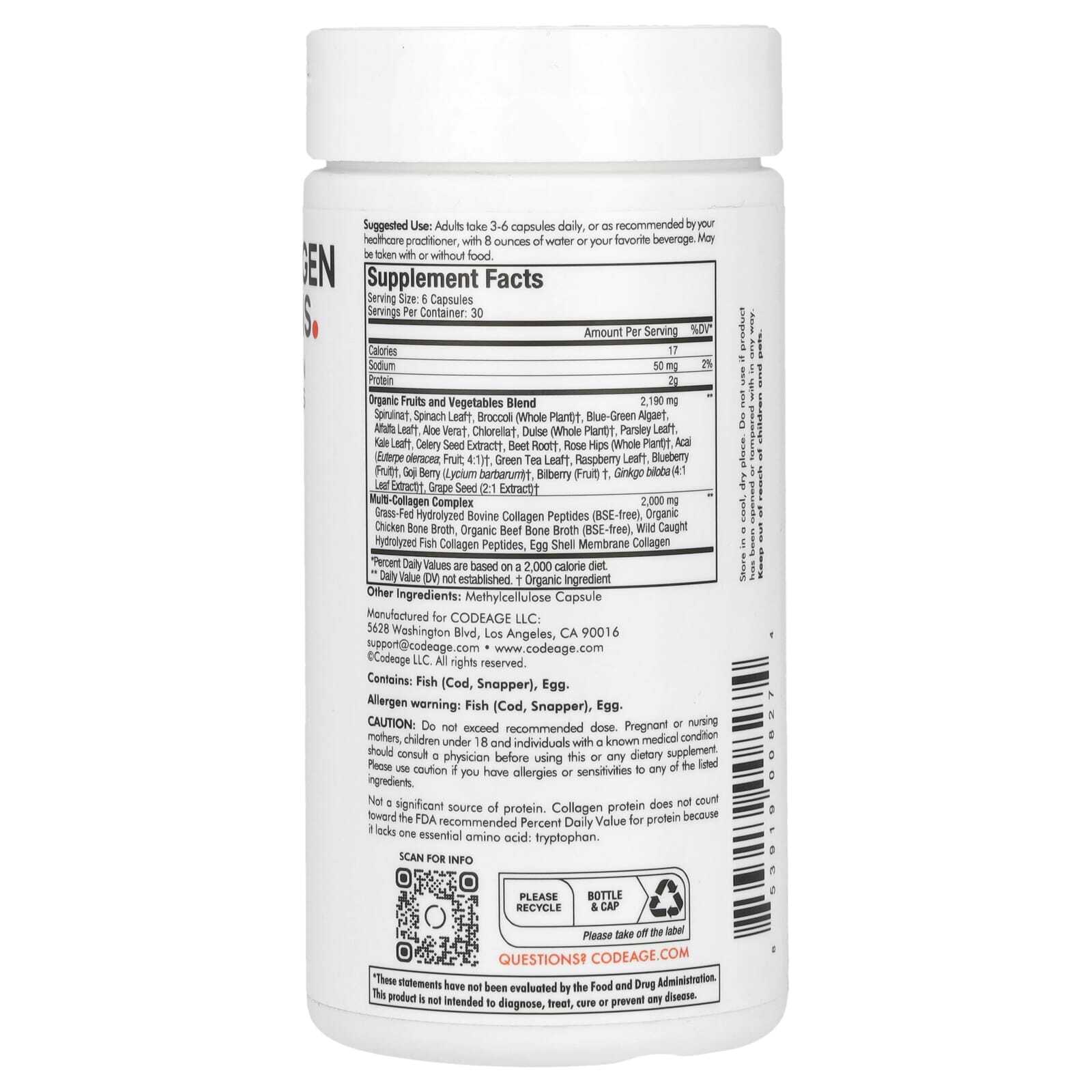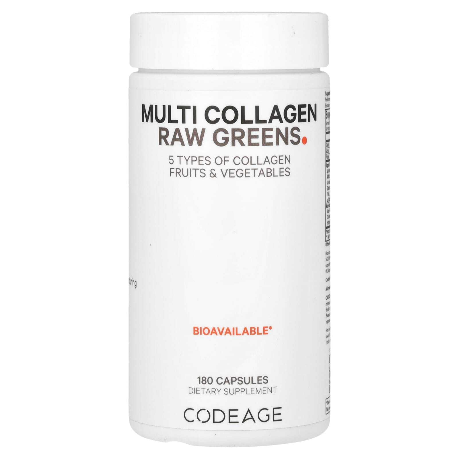 Добавка Codeage Multi Collagen Raw Greens в капсулах предлагает 5 типов коллагена из 5 различных источников пищи. Эта формула усилена 21 органической необработанной зеленью, фруктами и овощами, включая спирулину, брокколи, свеклу, алоэ вера, листья капусты, семена сельдерея, листья шпината и экстракты виноградных косточек. Эта коллагеновая добавка содержит 18 аминокислот, а также такие антиоксиданты, как голубика, листья малины, ягоды годжи, гинкго билоба и листья зеленого чая, обеспечивая комплексный подход к оздоровлению.