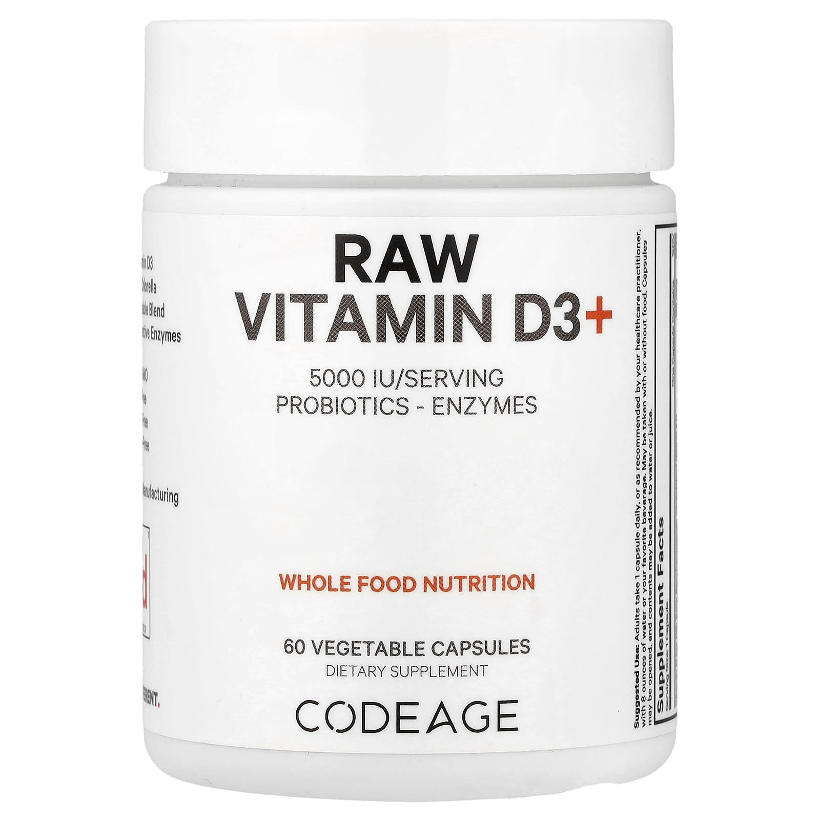 Добавка с необработанным витамином D3+ от Codeage содержит 5000 МЕ витамина D3, полученного из пекарских дрожжей (Saccharomyces cerevisiae), в состав которых входит спектр ингредиентов, в том числе такие фрукты, как яблоко, клубника, малина, ежевика, томат, зеленый болгарский перец и голубика, а также питательные вещества богатые овощи, такие как брокколи, брюссельская капуста, шпинат и кудрявая капуста.
