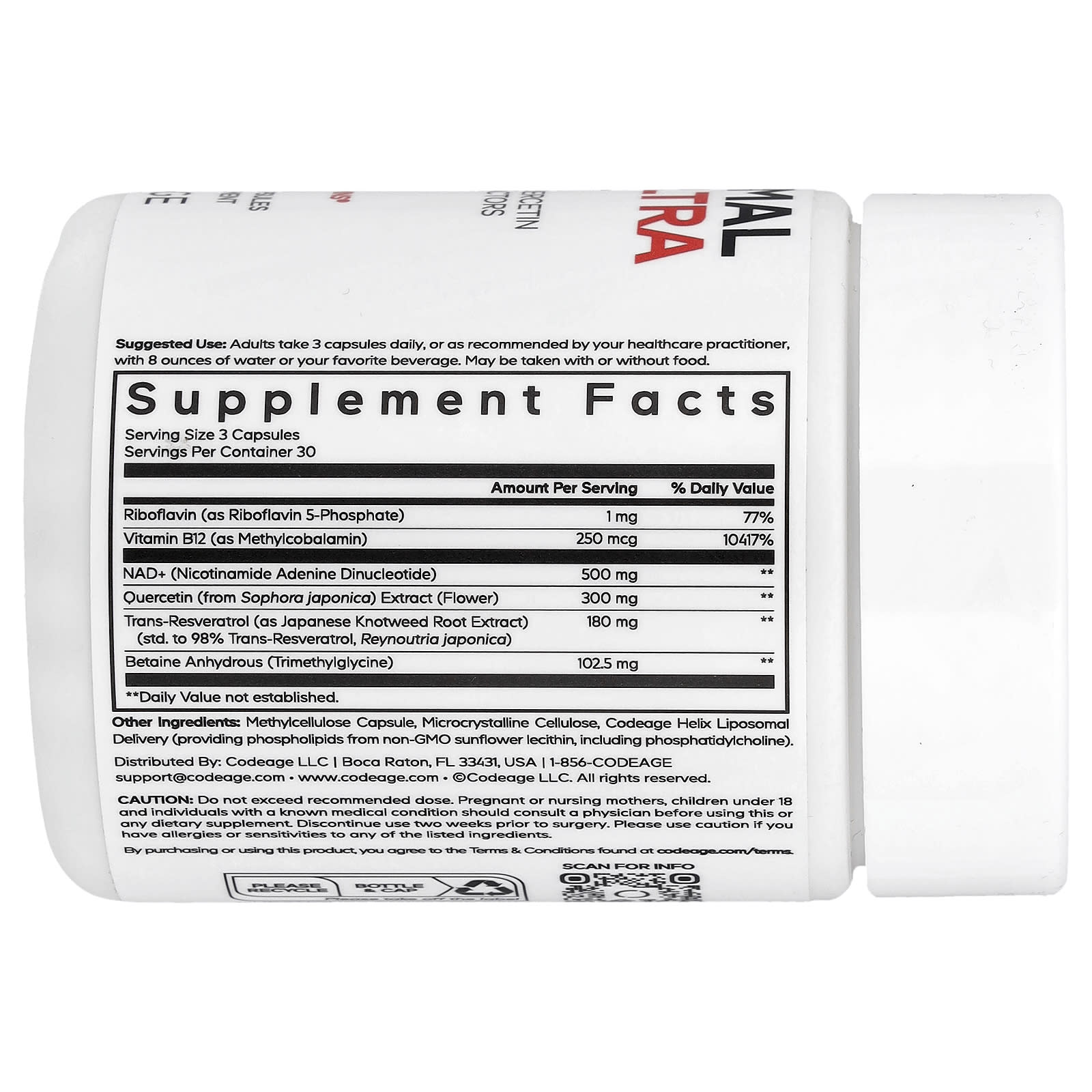 Капсулы добавки Codeage NAD + ULTRA содержат комплексную формулу, содержащую NAD +, кверцетин, ресвератрол, безводный бетаин, рибофлавин и витамин B12, которые помогают поддерживать здоровое старение, выработку энергии, клеток, а также общее самочувствие. Эта добавка с коэнзимом NAD поставляется в липосомальной форме для поддержки доставки и биодоступности.