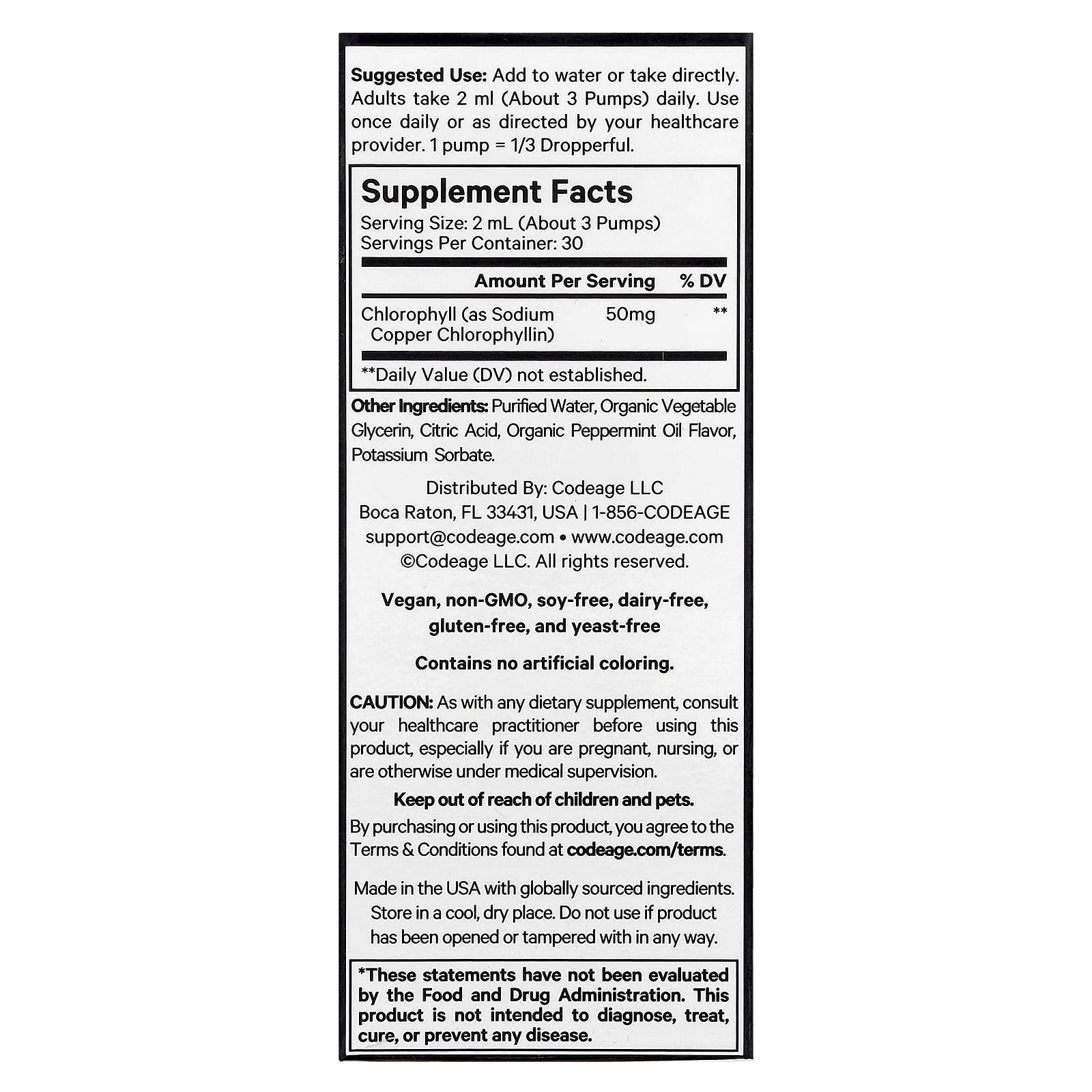 - Жидкие капли с хлорофиллом Codeage содержат 50 мг хлорофилла на порцию, предлагая простой способ включить этот зеленый пигмент в свой распорядок дня.