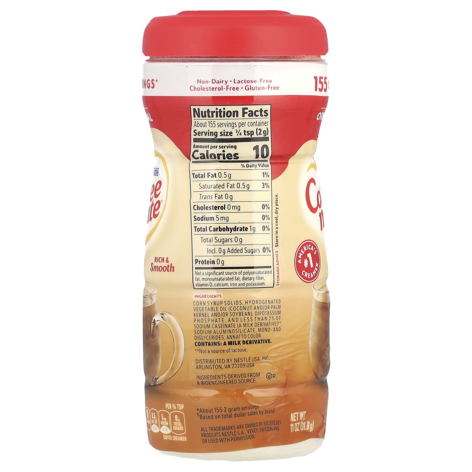 Сухая кукурузная патока, гидрогенизированное растительное масло (кокосовое и/или пальмоядровое и/или соевое), менее 2% казеината натрия (производное молока)**, моно- и диглицеридов, дикалийфосфата, алюмосиликата натрия, натуральных и искусственных ароматизаторов, красителя аннато.