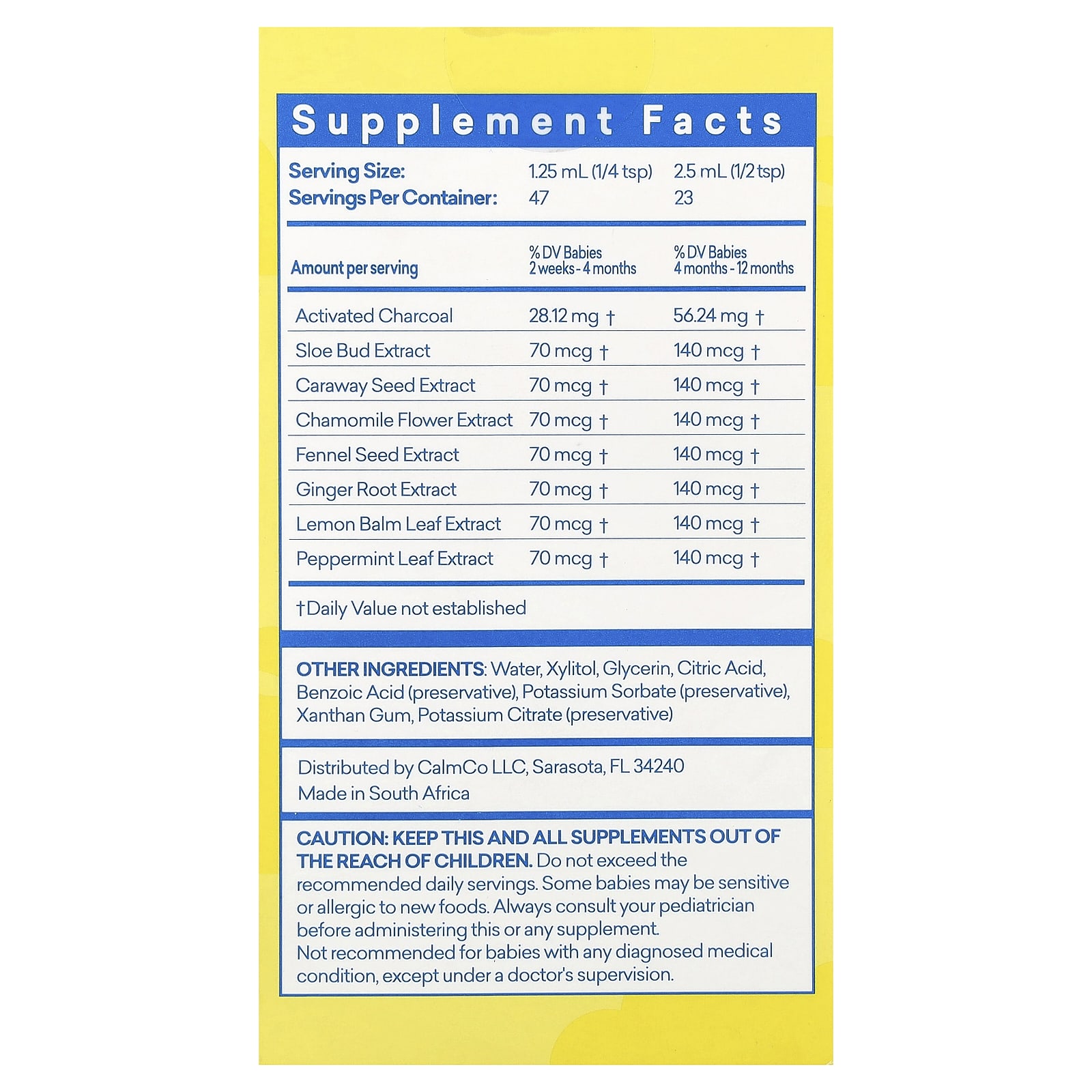 Храните этот продукт и все другие добавки в недоступном для детей месте. Не следует превышать рекомендуемую суточную норму. Новые продукты могут вызвать аллергию или повышенную чувствительность у некоторых младенцев. Всегда консультируйтесь с педиатром, прежде чем давать эту или любые другие пищевые добавки ребенку.
