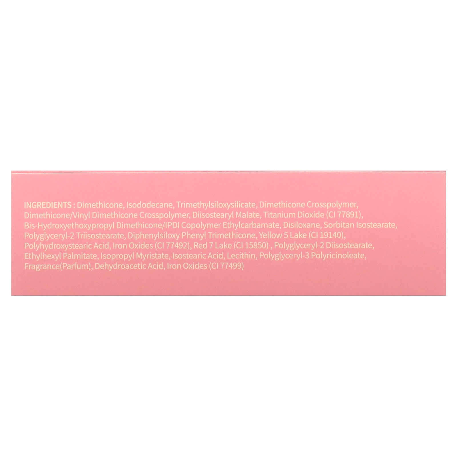 диметикон, изододекан, триметилсилоксисиликат, диметикон кроссполимер, диметикон/винил диметикон кроссполимер, диизостеарил малат, диоксид титана (CI 77891), бис-гидроксиэтоксипропил диметикон/изофорон диизоцианата сополимер этил карбамат, дисилоксан, сорбитан изостеарат, полиглицерил-2 триизостеарат, дифенил силокси фенилтриметикон, краситель жёлтый 5 лак (CI 19140), полигидроксистеариновая кислота, оксиды железа (CI 77492), краситель красный 7 лак (CI 15850) , полиглицерил-2 диизостеарат, этилгексил пальмитат, изопропил миристат, изостеариновая кислота, лецитин, полиглицерил-3-полирицинолеат, отдушка, дегидроуксусная кислота, оксиды железа (CI 77499).
