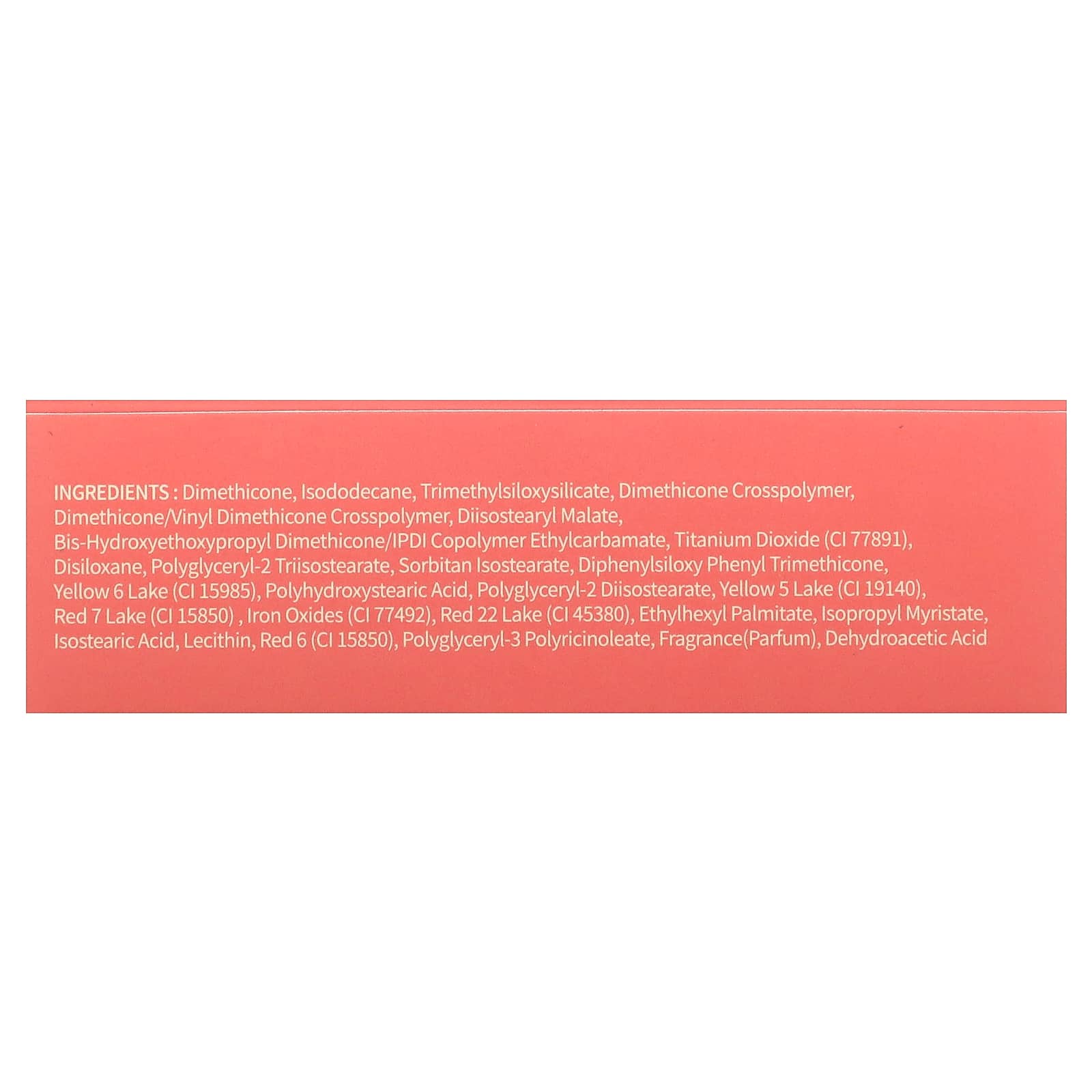 Диметикон, изододекан, триметилсилоксисиликат, диметикон кроссполимер, диметикон/винил диметикон кроссполимер, диизостеарил малат, бисгидроксиэтоксипропил диметикон/изофорон диизостеарил малат этилкарбамат, диоксид титана (CI 77891), дисилоксан, полиглицерил-2 триизостеарат, сорбитан изостеарат, дифенилсилоксифенилтриметикон, краситель желтый 6 лак (CI 15985), полигидроксистеариновая кислота, полиглицерил-2 диизостеарат, краситель желтый 5 лак (CI 19140), краситель красный 7 лак (CI 15850), оксиды железа (CI 77492), краситель красный 22 лак (CI 45380), этилгексил пальмитат, изопропил миристат, изостеариновая кислота, лецитин, краситель красный 6 (CI 15850), полиглицерил-3-полирицинолеат, отдушка (парфюмерная композиция), дегидроуксусная кислота.
