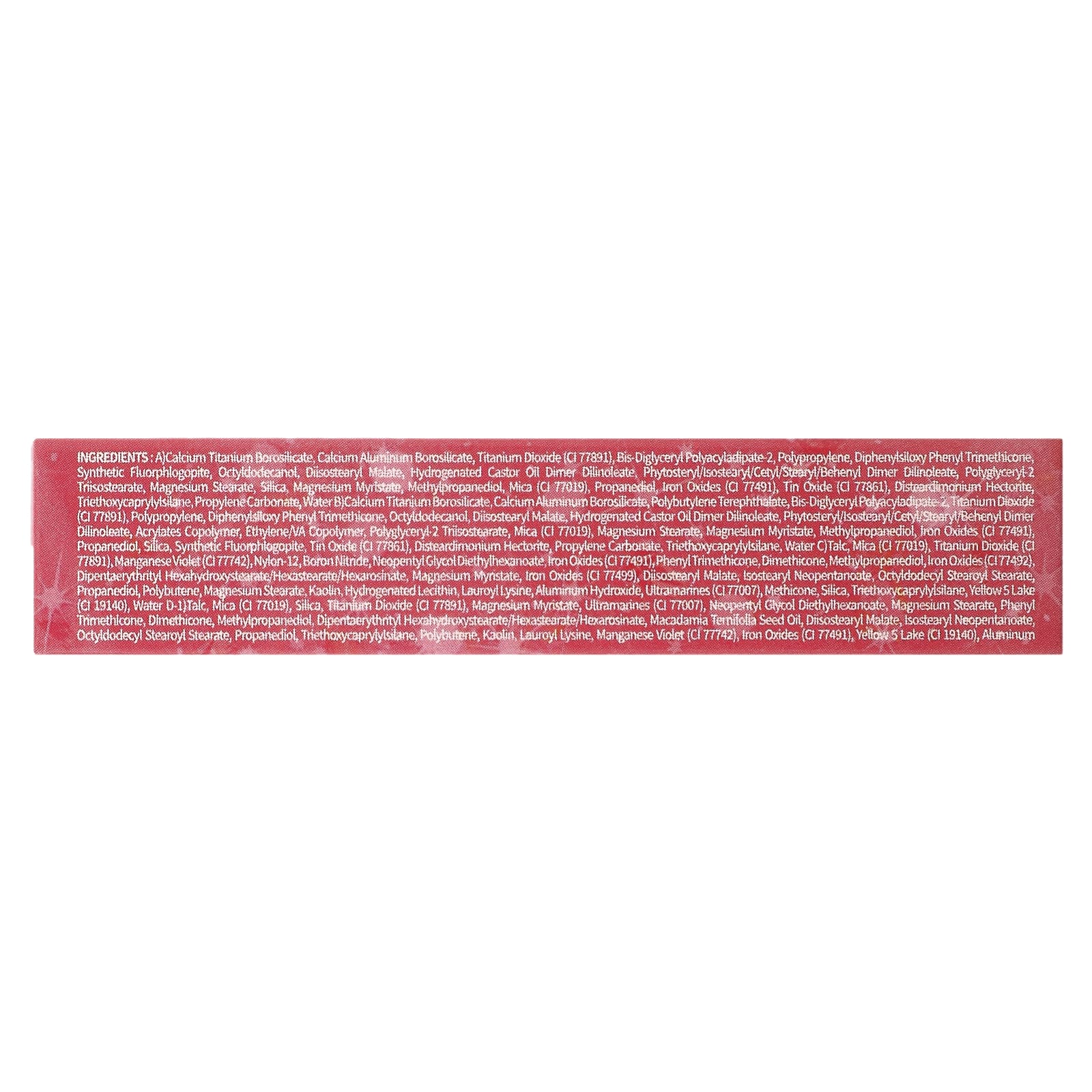A) Боросиликат кальция и титана, кальций алюминий боросиликат, диоксид титана (CI 77891), бис-диглицерил полиациладипат-2, полипропилен, дифенил силокси фенилтриметикон, синтетический фторфлогопит, октилдодеканол, диизостеарил малат, гидрогенизированное касторовое масло димердилинолеат, фитостерил/изостеарил/цетил/стеарил/бегенил димер дилинолеат, полиглицерил 2 триизостеарат, стеарат магния, диоксид кремния, миристат магния, метилпропандиол, слюда (CI 77019), пропандиол, оксиды железа (CI 77491), оксид олова (CI 77861), дистеардимония гекторит, триэтоксикаприлилсилан, пропиленкарбонат, вода б) кальция и боросиликата титана, кальций алюминий боросиликат, полибутилентерефталат, бис-диглицерил полиациладипат 2, диоксид титана (CI 77891), полипропилен, дифенил силокси фенилтриметикон, октилдодеканол, диизостеарил малат, гидрогенизированное касторовое масло димердилинолеат, фитостерил/изостеарил/цетил/стеарил/бегенил димер дилинолеат, сополимер акрилатов, сополимер этилена и ВА, полиглицерил 2 триизостеарат, слюда (CI 77019), стеарат магния, миристат магния, метилпропандиол, оксиды железа (CI 77491), пропандиол, диоксид кремния, синтетический фторфлогопит, оксид олова (CI 77861), дистеардимония гекторит, пропиленкарбонат, триэтоксикаприлилсилан, вода в) тальк, слюда (CI 77019), диоксид титана (CI 77891), краситель темно-фиолетовый (CI 77742), нейлон-12, нитрид бора, неопентилгликоль диэтилгексаноат, оксиды железа (CI 77491), фенилтриметикон, диметикон, метилпропандиол, оксиды железа (CI 77492), дипентаэритритил гексагидроксистеорат/гексастерат/гексаросинат, миристат магния, оксиды железа (CI 77499), диизостеарил малат, изостеарил неопентаноат, октилдодецил стеароил стеарат, пропандиол, полибутен, стеарат магния, каолин, гидрогенизированный лецитин, лаурил лизин, гидроксид алюминия, ультрамарины (CI 77007), метикон, диоксид кремния, триэтоксикаприлилсилан, краситель желтый 5 лак (CI 19140), вода d-1) тальк, слюда (CI 77019), диоксид кремния, диоксид титана (CI 77891), миристат магния, ультрамарины (CI 77007), неопентилгликоль диэтилгексаноат, стеарат магния, фенилтриметикон, диметикон, метилпропандиол, дипентаэритритил гексагидроксистеорат/гексастерат/гексаросинат, масло макадамии (Macadamia ternifolia), диизостеарил малат, изостеарил неопентаноат, октилдодецил стеароил стеарат, пропандиол, триэтоксикаприлилсилан, полибутен, каолин, лаурил лизин, краситель темно-фиолетовый (CI 77742), оксиды железа (CI 77491), краситель желтый 5 лак (CI 19140), алюминий.