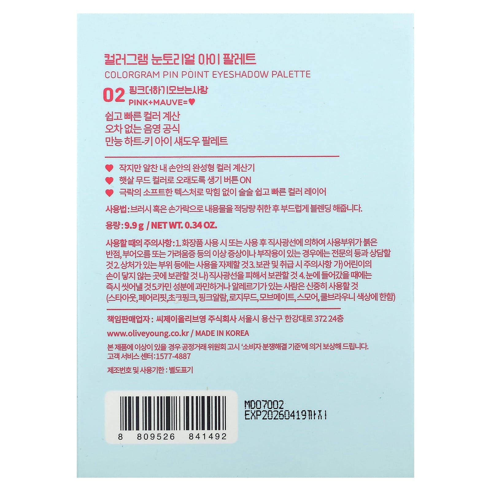 Colorgram, палитра теней для век, оттенок 02 розовый + лиловый = Love, 9,9 г (0,34 унции)