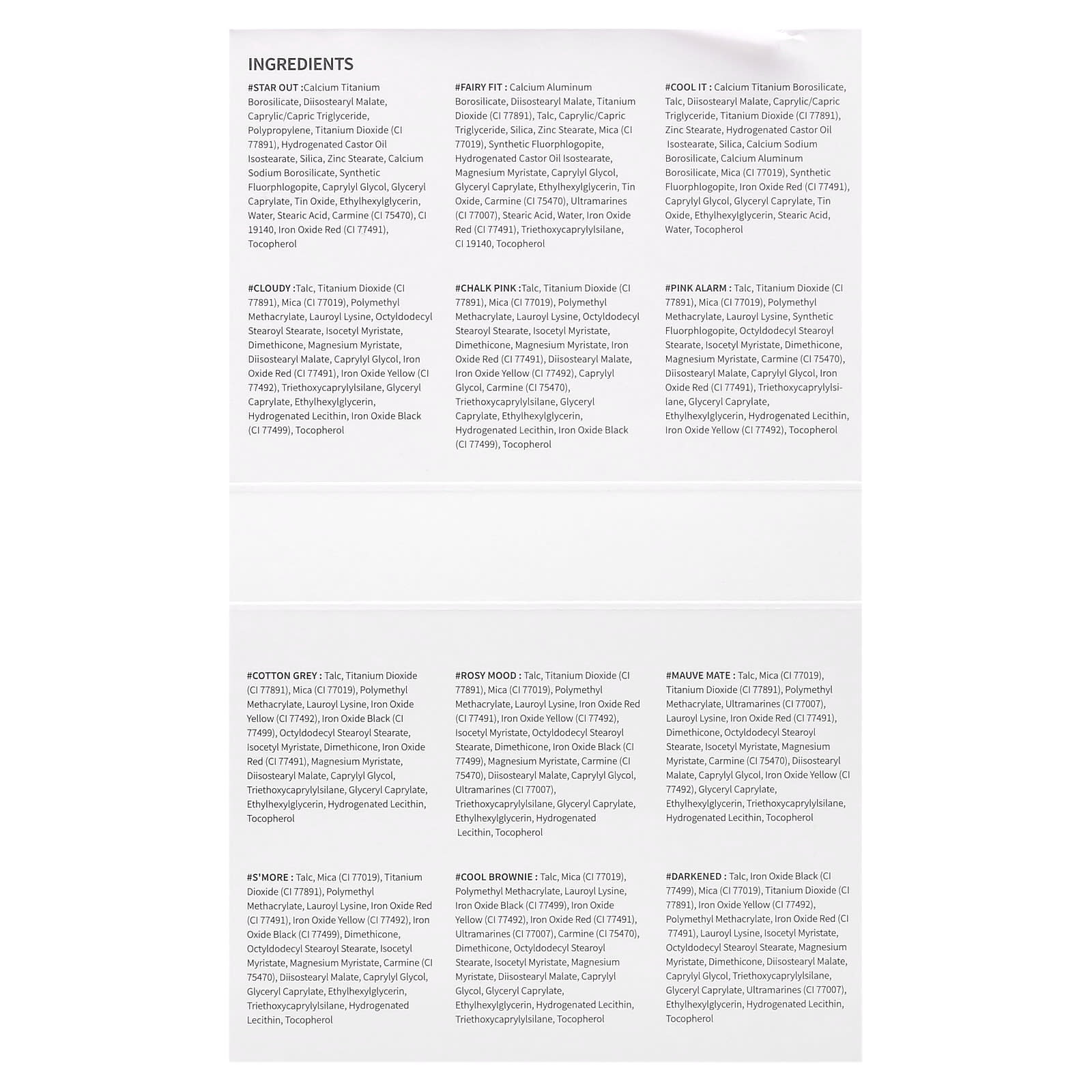 #Розовый: Тальк, диоксид титана (CI 77891), слюда (CI 77019), полиметилметакрилат, лаурил лизин, октилдодецил стеароил стеарат, изоцетил миристат, диметикон, миристат магния, оксид железа красный (CI 77491), диизостеарил малат, железа оксид желтый (CI 77492), каприлилгликоль, кармин (CI 75470), триэтоксикаприлилсилан, глицерил каприлат, этилгексилглицерин, гидрогенизированный лецитин, оксид железа черный (CI 77499), токоферол.