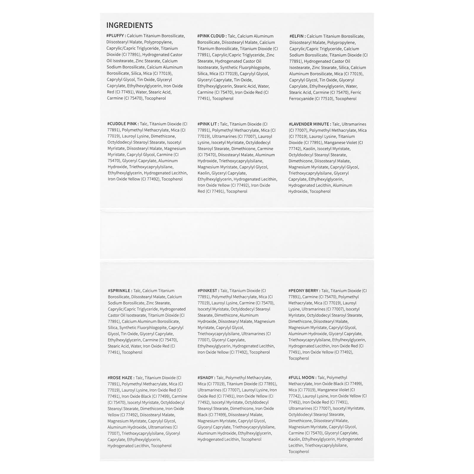 #Розовый: Тальк, диоксид титана (CI 77891), полиметилметакрилат, слюда (CI 77019), ультрамарины (CI 77007), лаурил лизин, изоцетил миристат, октилдодецил стеароил стеарат, диметикон, кармин (CI 75470), диизостеарил малат, гидроксид алюминия, триэтоксикаприлилсилан, миристат магния, каприлилгликоль, каолин, глицерил каприлат, этилгексилглицерин, гидрогенизированный лецитин, железа оксид желтый (CI 77492), оксид железа красный (CI 77491), токоферол.