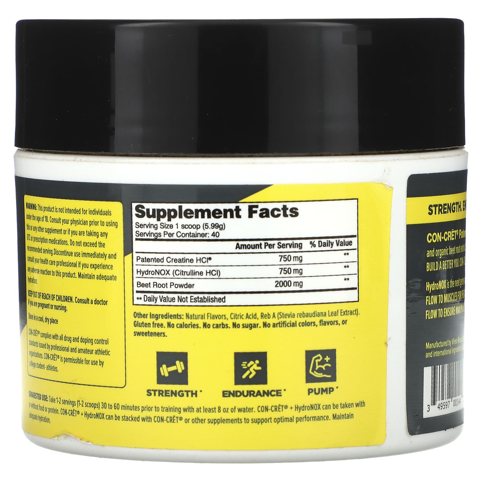 Запатентованный креатинHCl® CON-CRET® теперь с дополнительными преимуществами HydroNOX и экстракта органической корнеплода свеклы. Способствует расширению сосудов, обеспечивая улучшенный приток питательных веществ и кислорода. CON-CRET с оксидом азота можно принимать с любой добавкой для физической активности.