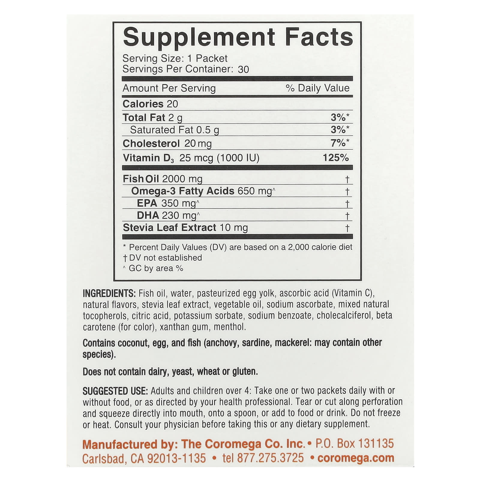 Рыбий жир, вода, пастеризованный яичный желток, аскорбиновая кислота (витамин С), натуральные ароматизаторы, экстракт листьев стевии, растительное масло, аскорбат натрия, смешанные натуральные токоферолы, лимонная кислота, сорбат калия, бензоат натрия, холекальциферол, бета-каротин (краситель), ксантановая камедь, ментол.