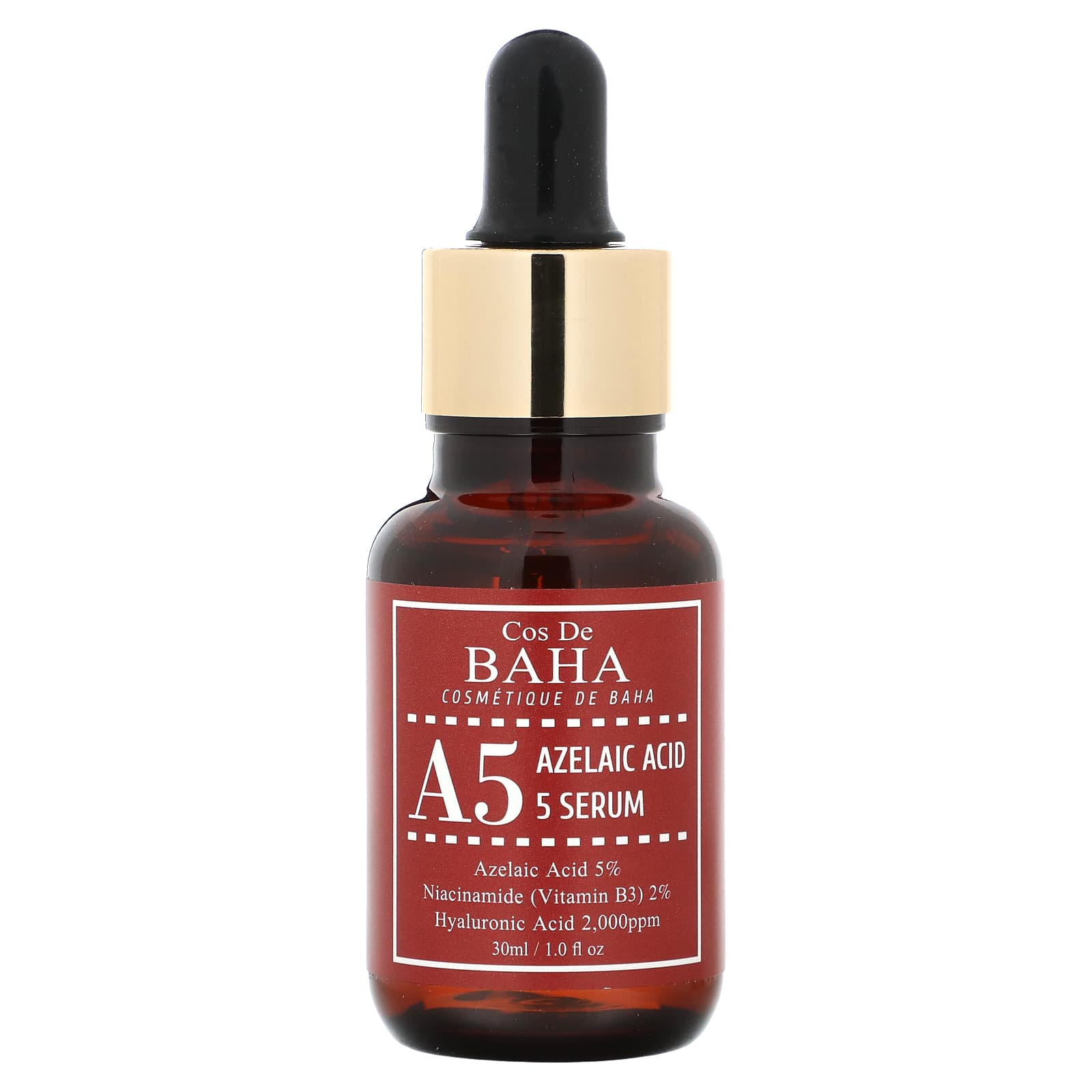 Сыворотка Cos De BAHA A5 содержит 5% азелаиновой кислоты, витамин B5 (D-пантенол), никотинамид (витамин B3) 2% и гиалуроновую кислоту.