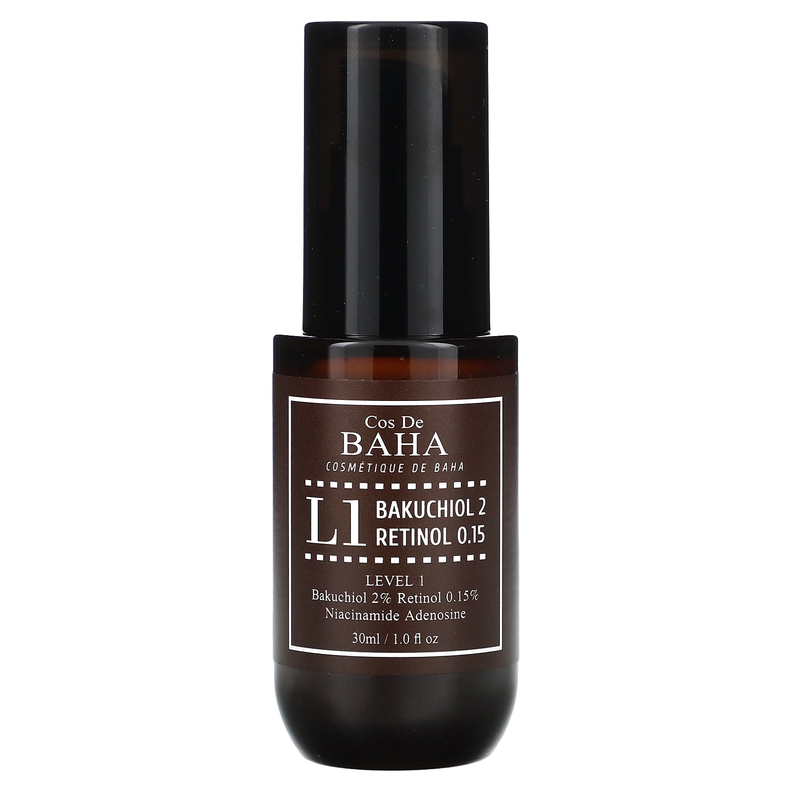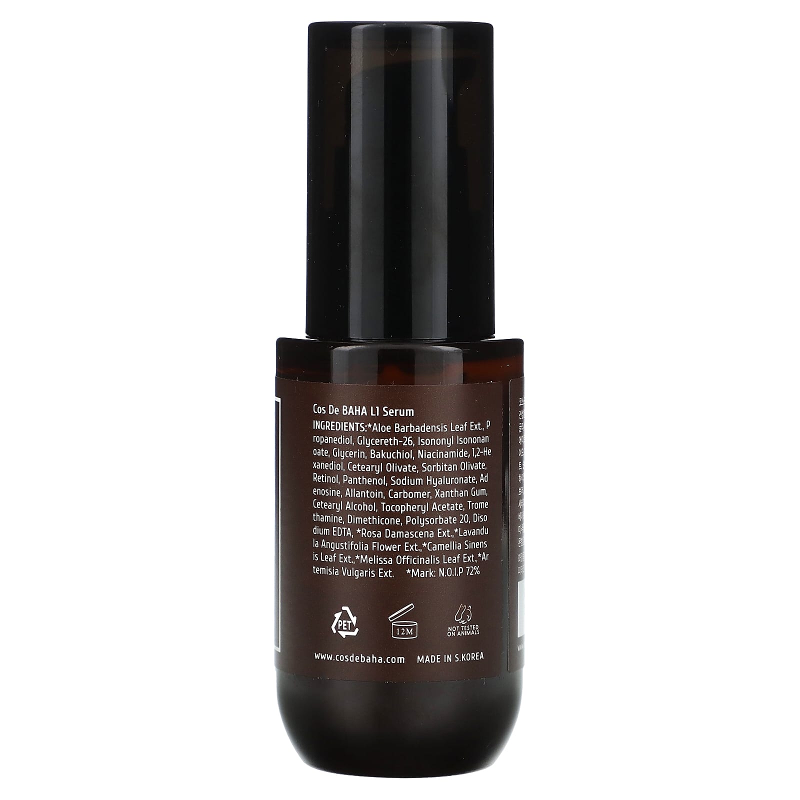Сыворотка Cos De BAHA L1 содержит бакучиол 2%, ретинол 0,15%, гиалуроновую кислоту, витамин E, аденозин, никотинамид и натуральные экстракты трав в качестве активных ингредиентов.