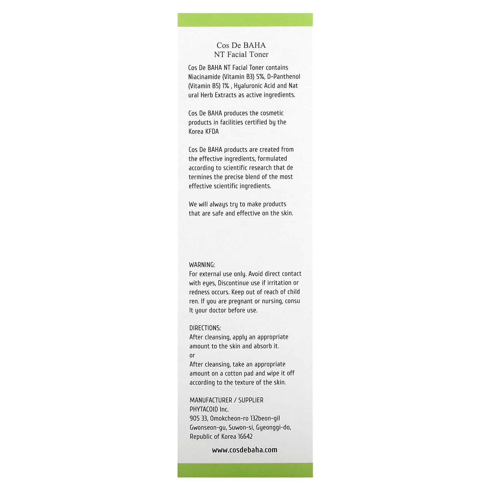 Тоник для лица Cos De BAHA NT содержит ниацинамид (витамин B3) 5%, D-пантенол (витамин B5) 1%, гиалуроновую кислоту и экстракты натуральных трав в качестве активных ингредиентов.