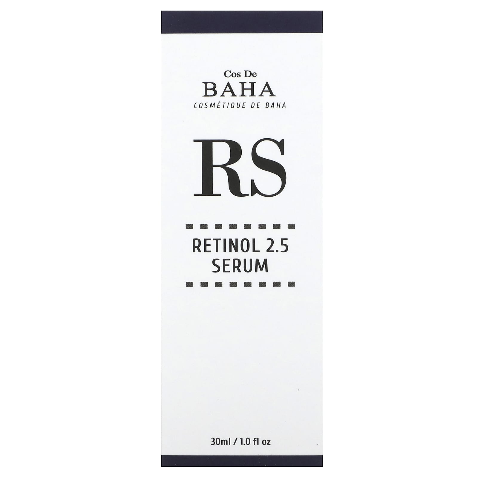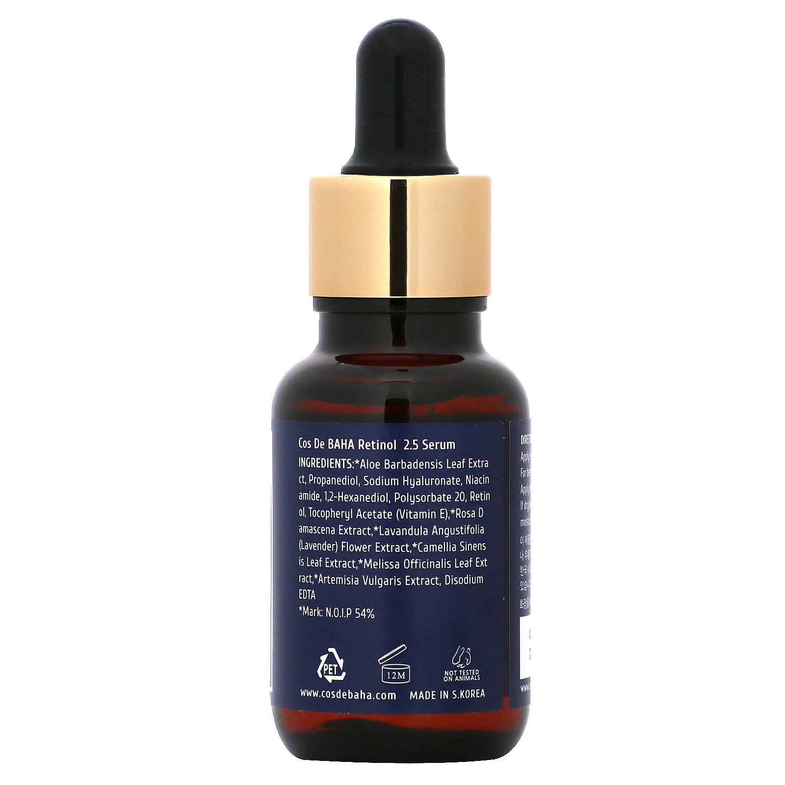 Сыворотка Cos De BAHA Retinol 2.5 содержит чистый раствор ретинола, гиалуроновую кислоту, витамин E, ниацинамид и натуральные экстракты трав в качестве активных ингредиентов.