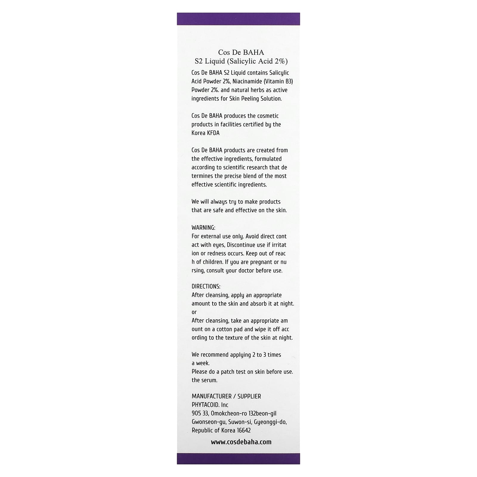 Жидкость Cos De BAHA S2 содержит порошок салициловой кислоты 2%, порошок ниацинамида (витамин B3) 2% и натуральные травы в качестве активных ингредиентов для решения для пилинга кожи.