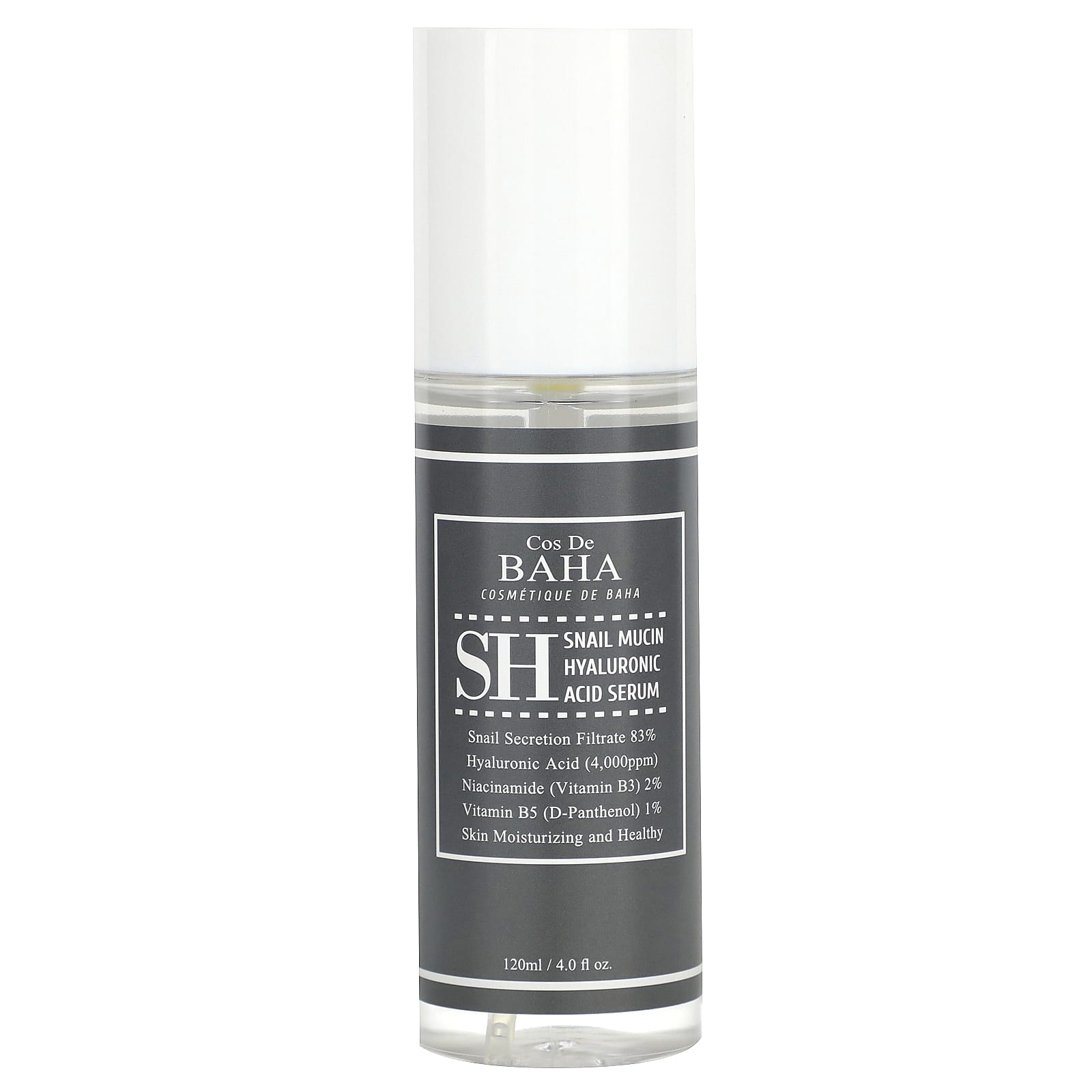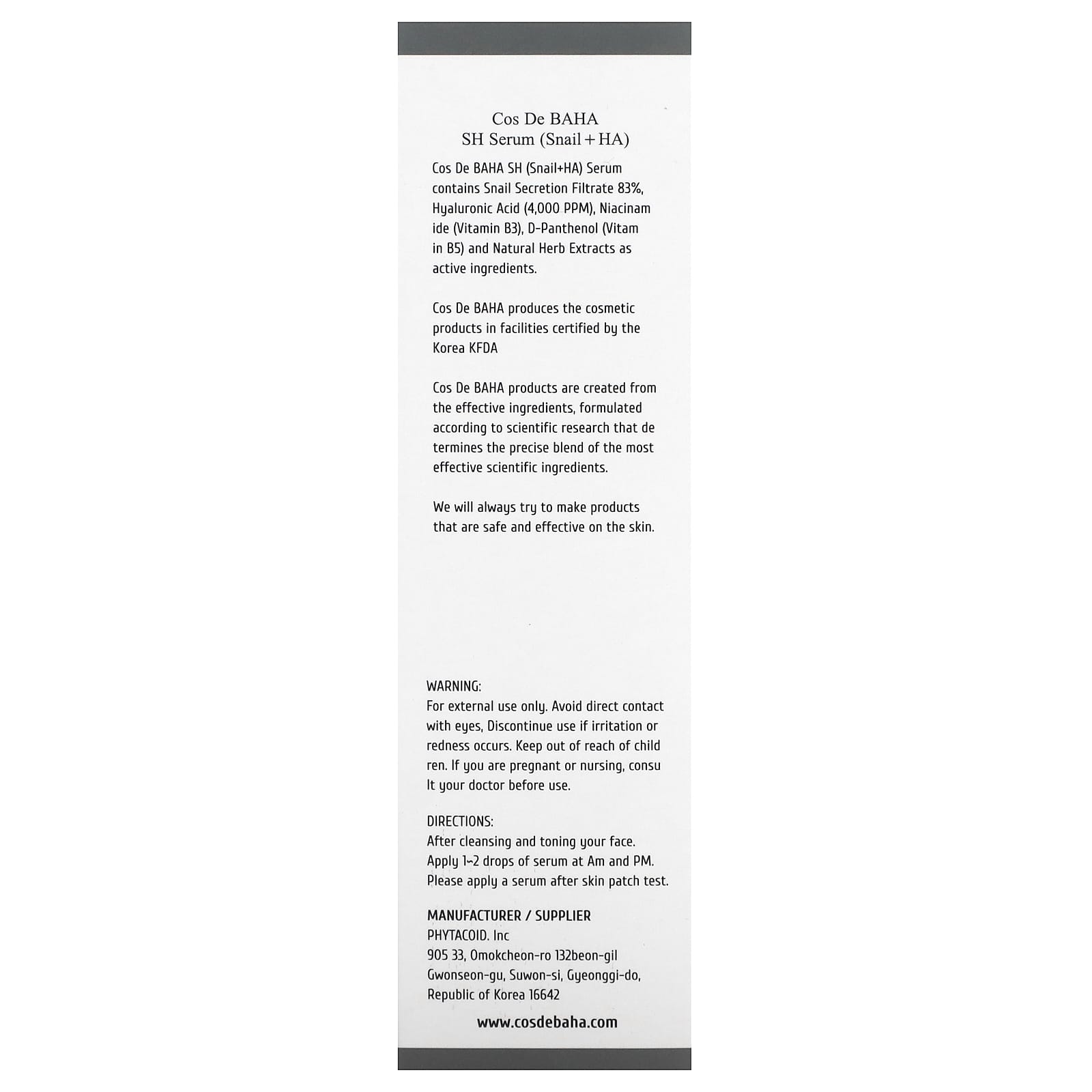 Сыворотка Cos De BAHA SH (Snail + HA) содержит 83% фильтрата секрета улитки, гиалуроновую кислоту (4000 част. / Млн), никотинамид (витамин B3), D-пантенол (витамин B5) и экстракты натуральных трав в качестве активных ингредиентов.
