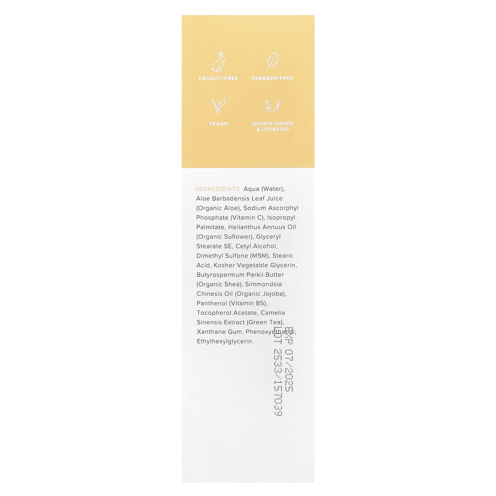 вода, сок листьев алоэ барбаденсис (органическое алоэ), аскорбил фосфат натрия (витамин C), изопропилпальмитат, масла helianthus annuus (органический подсолнечник), глицерил стеарат эмульгирующий, цетиловый спирт, диметилсульфон (МСМ), стеариновая кислота, кошерный растительный глицерин, органическое масло ши (Butyrospermum parkii), органическое масло жожоба (simmondsia chinensis), пантенол (витамин B5), токоферола ацетат, экстракт камелии китайской (зеленый чай), ксантановая камедь, феноксиэтанол, этилгексилглицерин.