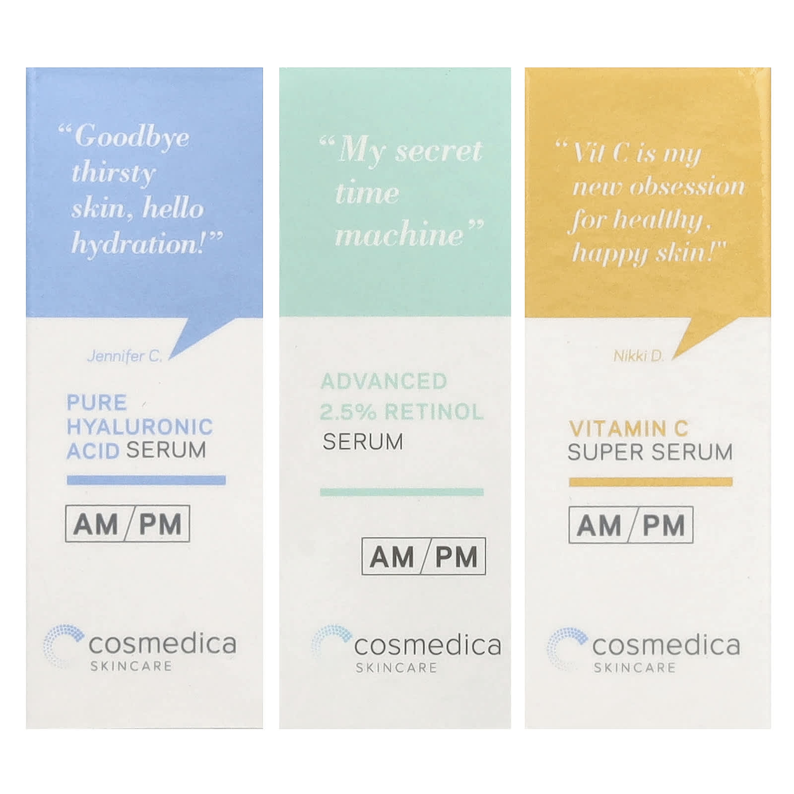 Наши самые популярные сыворотки в пробниках. Сыворотка с чистой гиалуроновой кислотой обеспечивает увлажнение и сбалансированное увлажнение благодаря молекулярной силе, в 1000 раз превышающей ее вес в воде. Суперсыворотка с витамином C сочетает в себе тройную антиоксидантную защиту и осветляет тусклую кожу лица. Сыворотка с 2,5% ретинолом ускоряет клеточный обновление и выработку коллагена, делая кожу более сияющей и здоровой.
