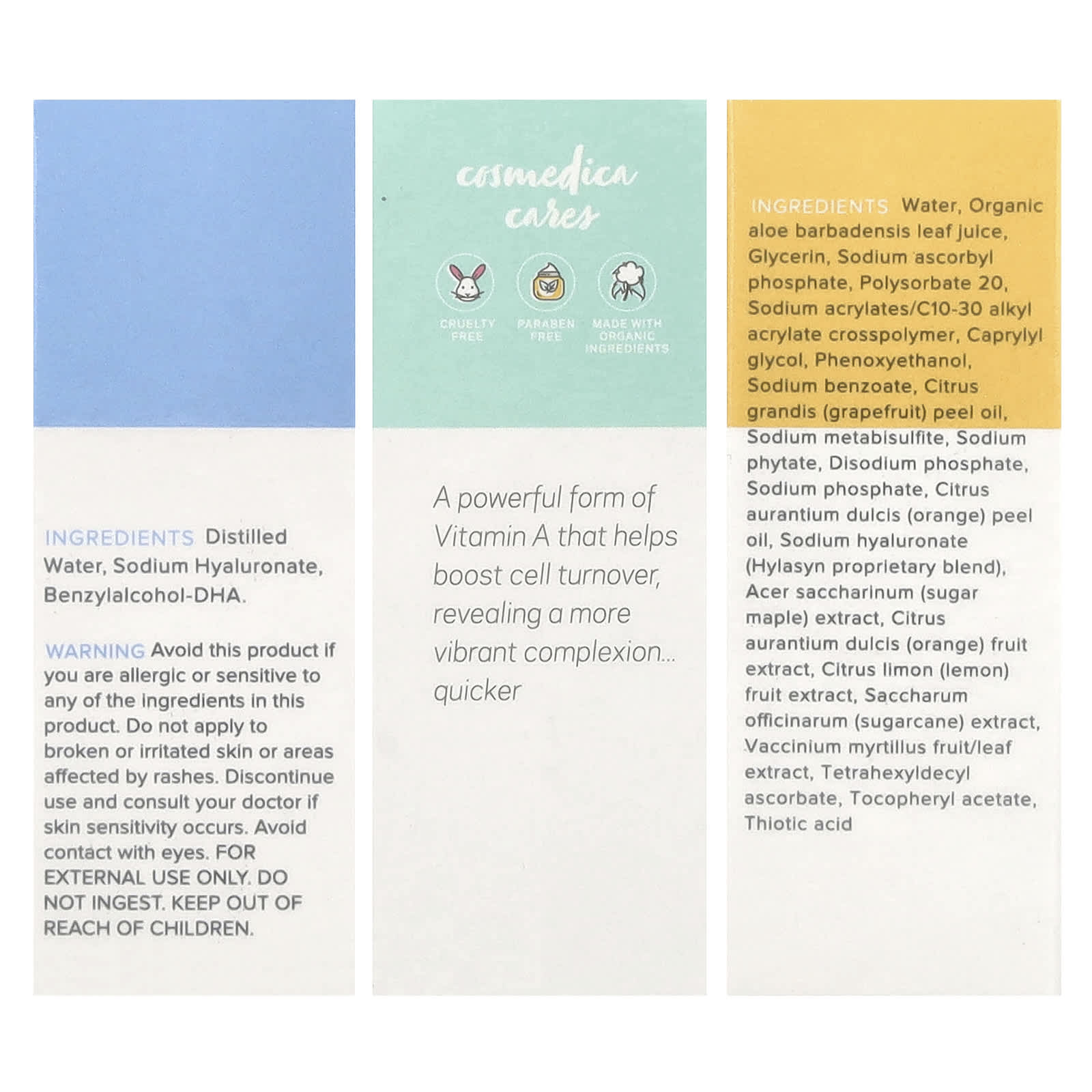 Сыворотка с витамином C: Вода, органический сок листьев алоэ вера (Aloe barbadensis), глицерин, аскорбил фосфат натрия, полисорбат 20, кроссполимер акрилатов натрия/c10-30 алкил акрилата, каприлилгликоль, феноксиэтанол, бензоат натрия, масло из цедры грейпфрута (Citrus grandis), метабисульфит натрия, фитат натрия, динатрий фосфат, фосфат натрия, масло из цедры апельсина (Citrus aurantium dulcis), гиалуронат натрия (запатентованная смесь Hylasyn), экстракт сахарного клена (Acer saccharum), экстракт апельсина (Citrus aurantium dulcis), экстракт лимона (Citrus limon), экстракт сахарного тростника (Saccharum officinarum), экстракт плодов/листьев черники (Vaccinium myrtillus), тетрагексилдецил аскорбат, токоферилацетат, тиоктовая кислота.