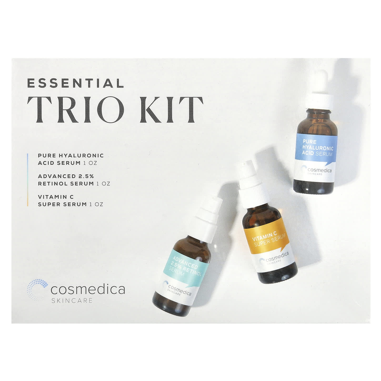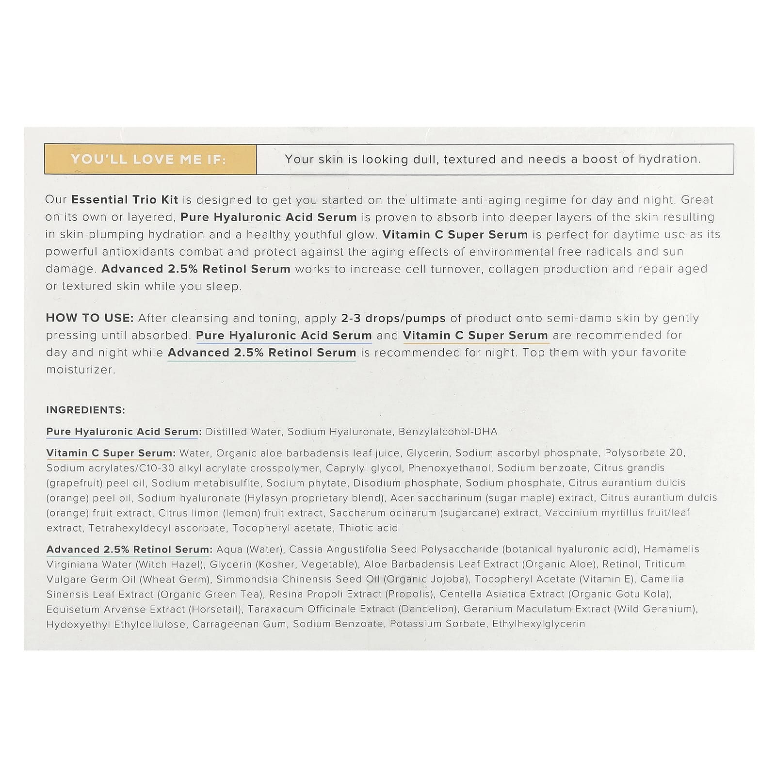 Наш набор Essential Trio предназначен для того, чтобы помочь вам перейти на идеальный омолаживающий режим для дневного и ночного ухода. Сыворотка с чистой гиалуроновой кислотой отлично подходит как сама по себе, так и в виде наслоения. Доказано, что она впитывается в глубокие слои кожи, обеспечивая упругость и увлажнение кожи, а также придавая ей здоровое сияние молодости. Суперсыворотка с витамином C идеально подходит для дневного использования, поскольку ее мощные антиоксиданты борются и защищают от воздействия свободных радикалов из окружающей среды и повреждения от солнца. Улучшенная сыворотка с 2,5% ретинолом увеличивает клеточный обновление, выработку коллагена и восстанавливает возрастную или текстурированную кожу во время сна.