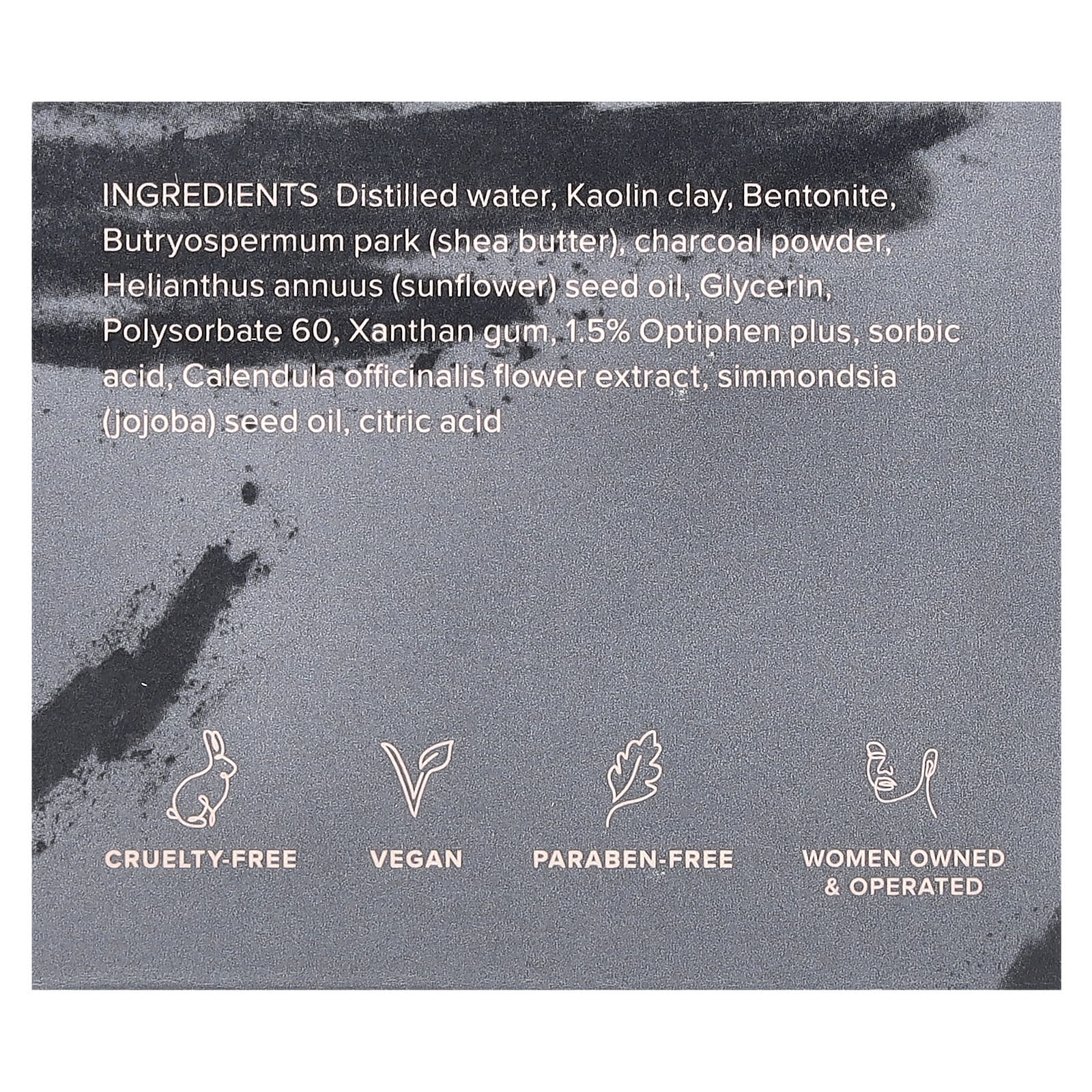 Дистиллированная вода, каолиновая глина, бентонит, масло ши (Butryospermum park), порошок из древесного угля, подсолнечное масло (Helianthus annuus), глицерин, полисорбат 60, ксантановая камедь, 1,5% Optiphen Plus, сорбиновая кислота, экстракт цветков календулы (Calendula officinalis), масло семян жожоба (Simmondsia), лимонная кислота.