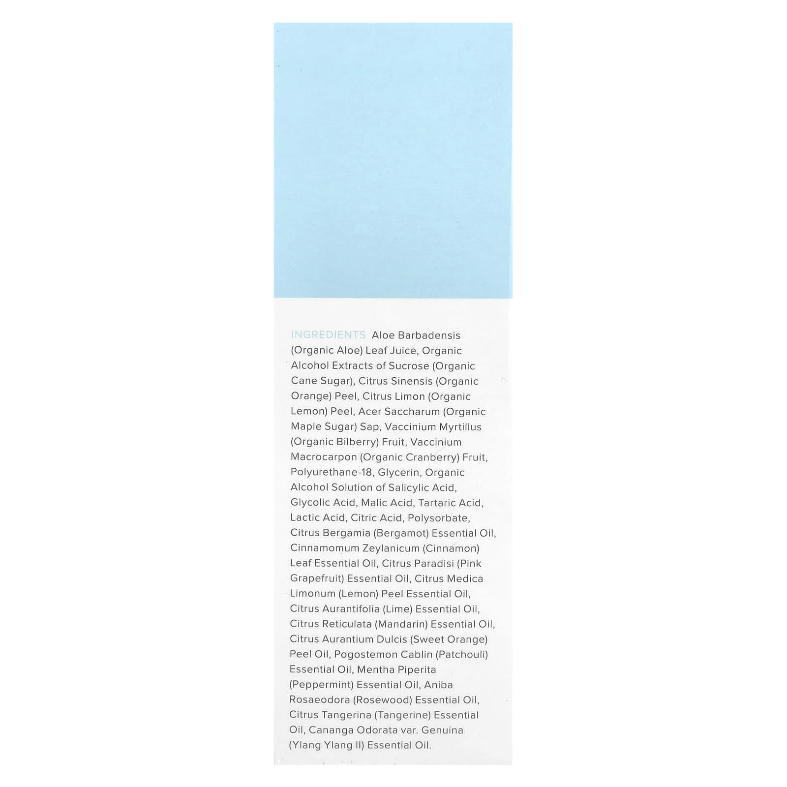 Сок из листьев органического алоэ вера (Aloe barbadensis), органические спиртовые экстракты сахарозы (органический тростниковый сахар), цедра органического апельсина (Citrus sinensis), цедра органического лимона (Citrus limon), органический сок кленового сахара (Acer saccharum), плоды органической черники (Vaccinium myrtillus), плоды органической клюквы (Vaccinium macrocarpon), полиуретан-18, глицерин, раствор салициловой кислоты в органическом спирте, гликолевая кислота, яблочная кислота, винная кислота, молочная кислота, лимонная кислота, полисорбат, эфирное масло бергамота (Citrus bergamia), эфирное масло из листьев корицы (Cinnamomum zeylanicum), эфирное масло розового грейпфрута (Citrus paradisi), эфирное масло из цедры лимона (Citrus medica limonum), эфирное масло лайма (Citrus aurantifolia), эфирное масло мандарина (Citrus reticulata), масло из цедры апельсина сладкого (Citrus aurantium dulcis), эфирное масло пачули (Pogostemon cablin), эфирное масло перечной мяты (Mentha piperita), эфирное масло розового дерева (Aniba rosaeodora), эфирное масло мандарина (Сitrus tangerina), cananga odorata вар. эфирное масло иланг-иланга ii.