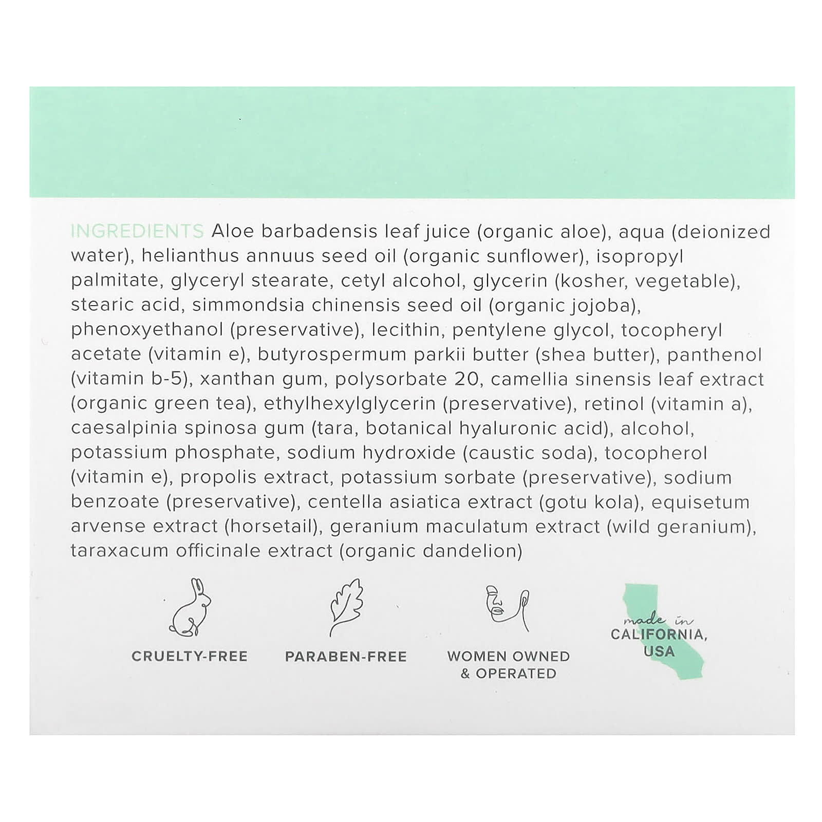 Органический сок листьев алоэ вера (Aloe barbadensis), деионизированная вода (Aqua), органическое масло семян подсолнечника (Helianthus annuus), изопропилпальмитат, глицерил стеарат, цетиловый спирт, глицерин (кошерный, растительный), стеариновая кислота, органическое масло семян жожоба (Simmondsia chinensis), феноксиэтанол (консервант), лецитин, пентилен гликоль, токоферилацетат (витамин Е), масло ши (Butyrospermum parkii), пантенол (витамин B-5), ксантановая камедь, полисорбат 20, органический экстракт листьев зеленого чая (Camellia sinensis), этилгексилглицерин (консервант), ретинол (витамин A), камедь тары [(Caesalpinia spinosa), (растительная гиалуроновая кислота)], спирт, фосфат калия, гидроксид натрия (каустическая сода), токоферол (витамин Е), экстракт прополиса, сорбат калия (консервант), бензоат натрия (консервант), экстракт готу колы (Centella asiatica), экстракт хвоща полевого (Equisetum arvense), экстракт герани дикой (Geranium maculatum), экстракт органического одуванчика (Taraxacum officinale).