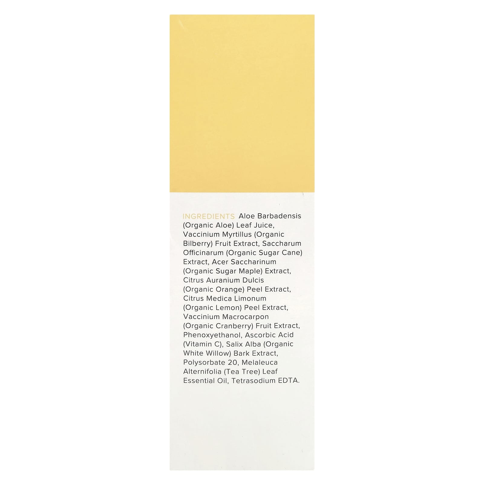 Сок из листьев органического алоэ вера (Aloe barbadensis), экстракт ягод органической черники (Vaccinium myrtillus), экстракт органического сахарного тростника (Saccharum officinarum), экстракт органического сахарного клена (Acer saccharinum), экстракт кожуры органического апельсина (Citrus auranium dulcis), экстракт кожуры органического лимона (Citrus medica limonum), экстракт плодов органической клюквы (Vaccinium macrocarpon), феноксиэтанол, аскорбиновая кислота (витамин C), экстракт коры органической белой ивы (Salix alba), полисорбат 20, эфирное масло из листьев чайного дерева (Melaleuca alternifolia), тетранатрия ЭДТК.