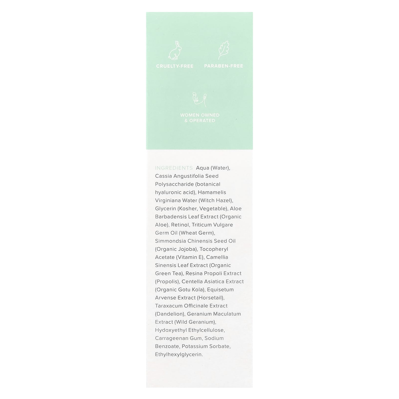 Вода, полисахарид из семян сенны александрийской (Cassia angustifolia) (растительная гиалуроновая кислота), вода из гамамелиса (Hamamelis virginiana), глицерин (кошерный, овощи), экстракт листьев органического алоэ вера (Aloe barbadensis), ретинол, масло из зародышей пшеницы (Triticum vulgare), органическое масло семян жожоба (Simmondsia chinensis), токоферилацетат (витамин Е), экстракт листьев органического зеленого чая (Camellia sinensis), экстракт прополиса, экстракт органической готу колы (Centella asiatica), экстракт хвоща полевого (Equisetum arvense), экстракт одуванчика (Taraxacum officinale), экстракт дикой герани (Geranium maculatum), гидроксиэтилэтилцеллюлоза, каррагинановая камедь, бензоат натрия, сорбат калия, этилгексилглицерин.