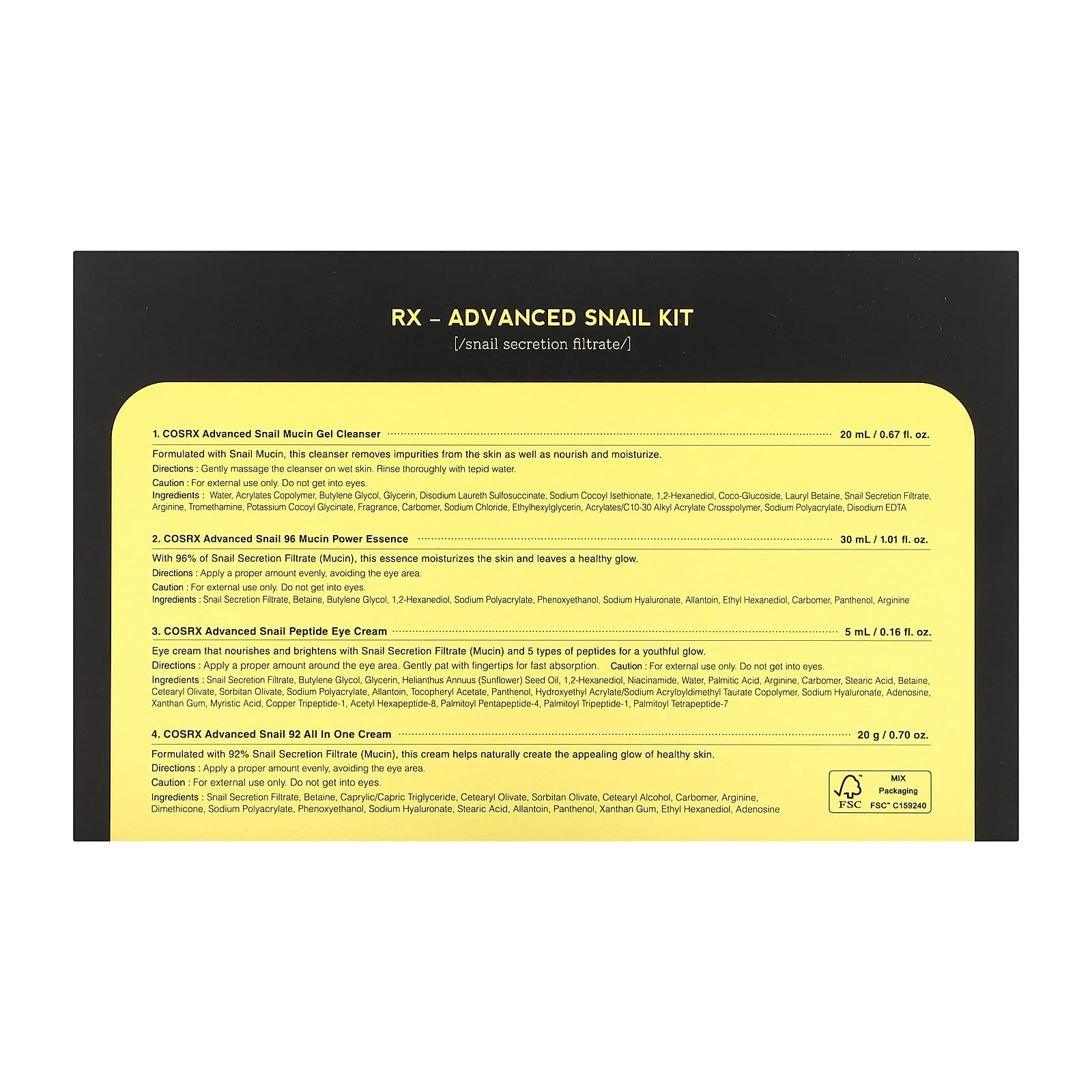 Фильтрат секрета улитки, бутиленгликоль, глицерин, подсолнечное масло (Helianthus annuus), 1,2-гександиол, никотинамид, вода, пальмитиновая кислота, аргинин, карбомер, стеариновая кислота, бетаин, цетеарил оливат, сорбитан оливат, полиакрилат натрия, аллантоин, токоферилацетат, пантенол, гидроксиэтил акрилат/натрия акрилоилдиметилтаурата сополимер, гиалуронат натрия, аденозин, ксантановая камедь, миристиновая кислота, трипептид меди-1, ацетил гексапептид-8, пальмитоил пентапептид-4, пальмитоил трипептид-1, пальмитоил тетрапептид-7.