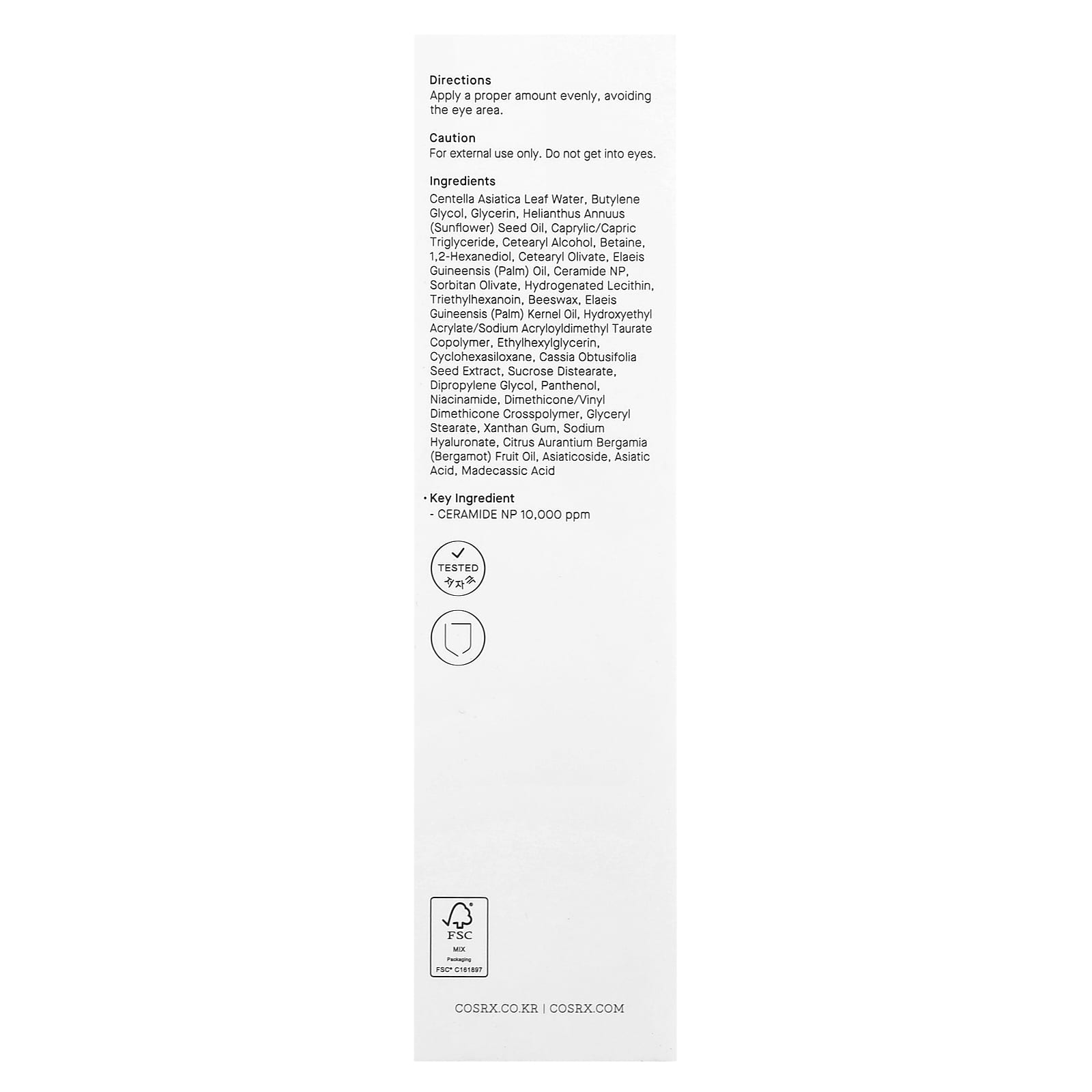 Вода из листьев готу колы (Centella asiatica), бутиленгликоль, глицерин, подсолнечное масло (Helianthus annuus), каприловый/каприновый триглицерид, цетеариловый спирт, бетаин, 1,2-гександиол, цетеарил оливат, пальмовое масло (Elaeis guineensis), керамид NP, сорбитан оливат, гидрогенизированный лецитин, триэтилгексаноин, пчелиный воск, пальмоядровое масло (Elaeis guineensis), гидроксиэтил акрилат/натрия акрилоилдиметилтаурата сополимер, этилгексилглицерин, циклогексасилоксан, экстракт семян кассии (Cassia obtusifolia), дистеарат сахарозы, дипропиленгликоль, пантенол, никотинамид, диметикон/винил диметикон кроссполимер, глицерил стеарат, ксантановая камедь, гиалуронат натрия, масло бергамота (Citrus aurantium bergamia), азиатикозид, азиатиковая кислота, мадекассовая кислота.