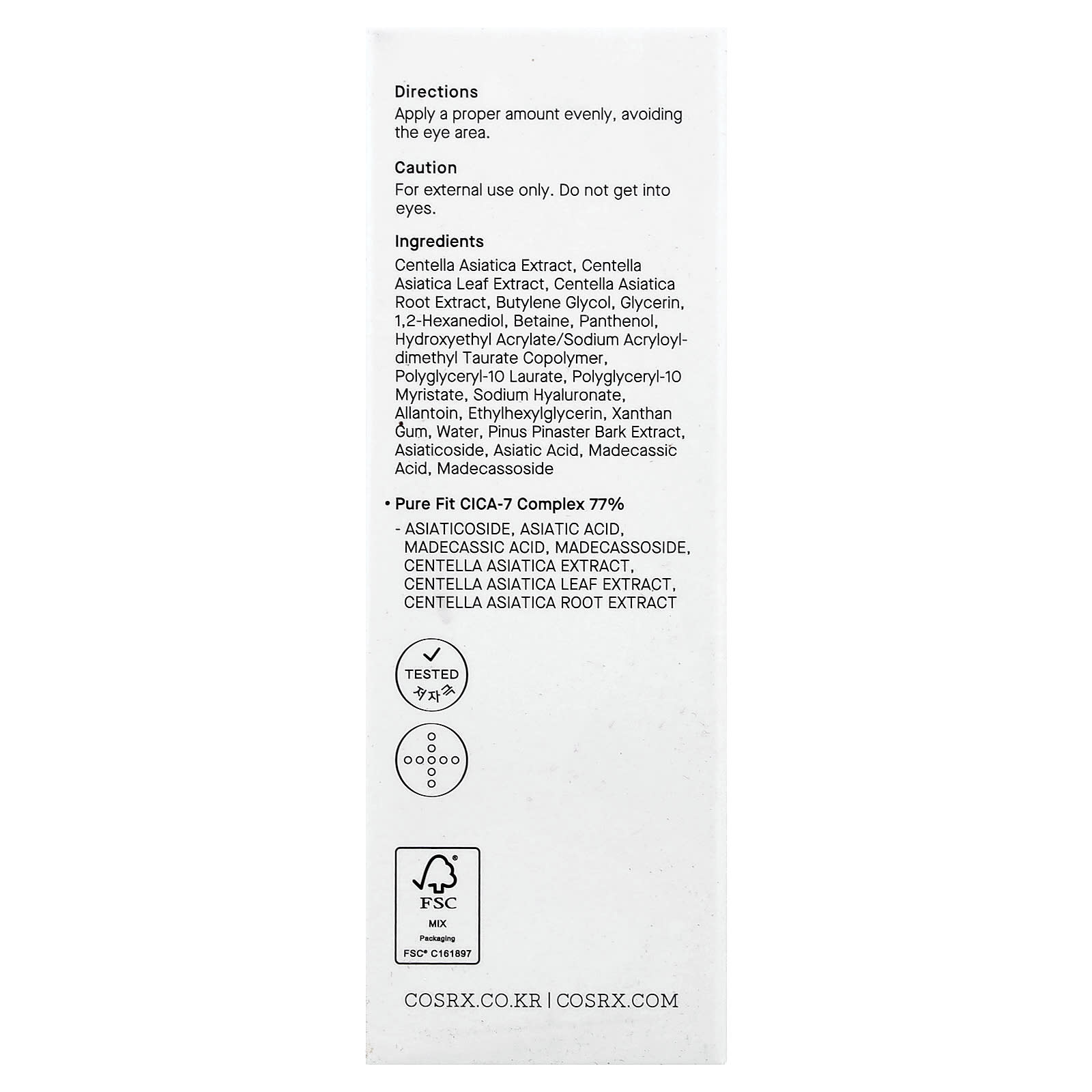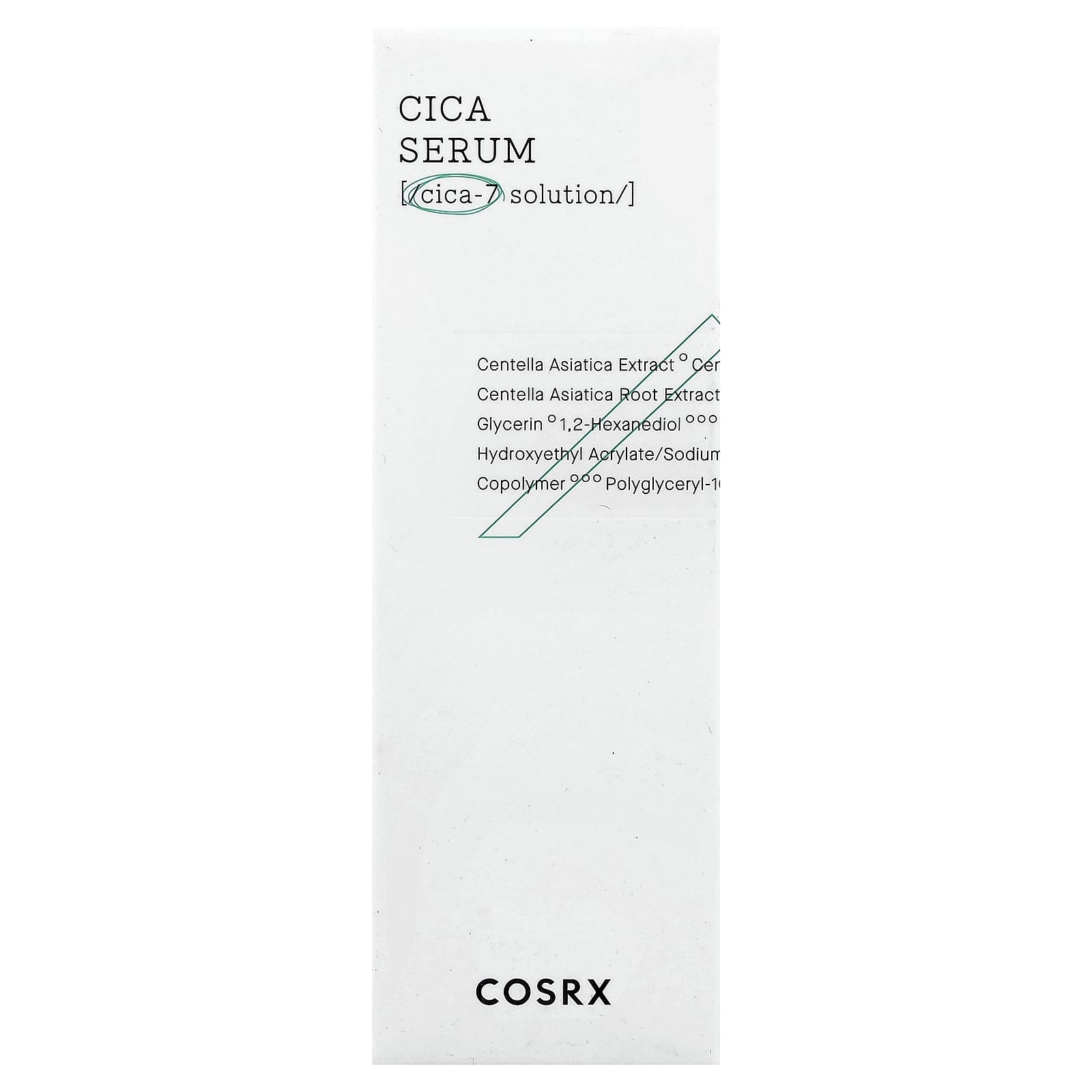 Экстракт готу колы (Centella asiatica), экстракт листьев готу колы (Centella asiatica), экстракт корня готу колы (Centella asiatica), бутиленгликоль, глицерин, 1,2-гександиол, бетаин, пантенол, гидроксиэтил акрилат/натрия акрилоилдиметилтаурата сополимер, полиглицерил-10 миристат, гиалуронат натрия, аллантоин, этилгексилглицерин, ксантановая камедь, вода, экстракт коры хвои сосны приморской (Pinus pinaster), азиатикозид, азиатиковая кислота, мадекассовая кислота, мадекассосид.