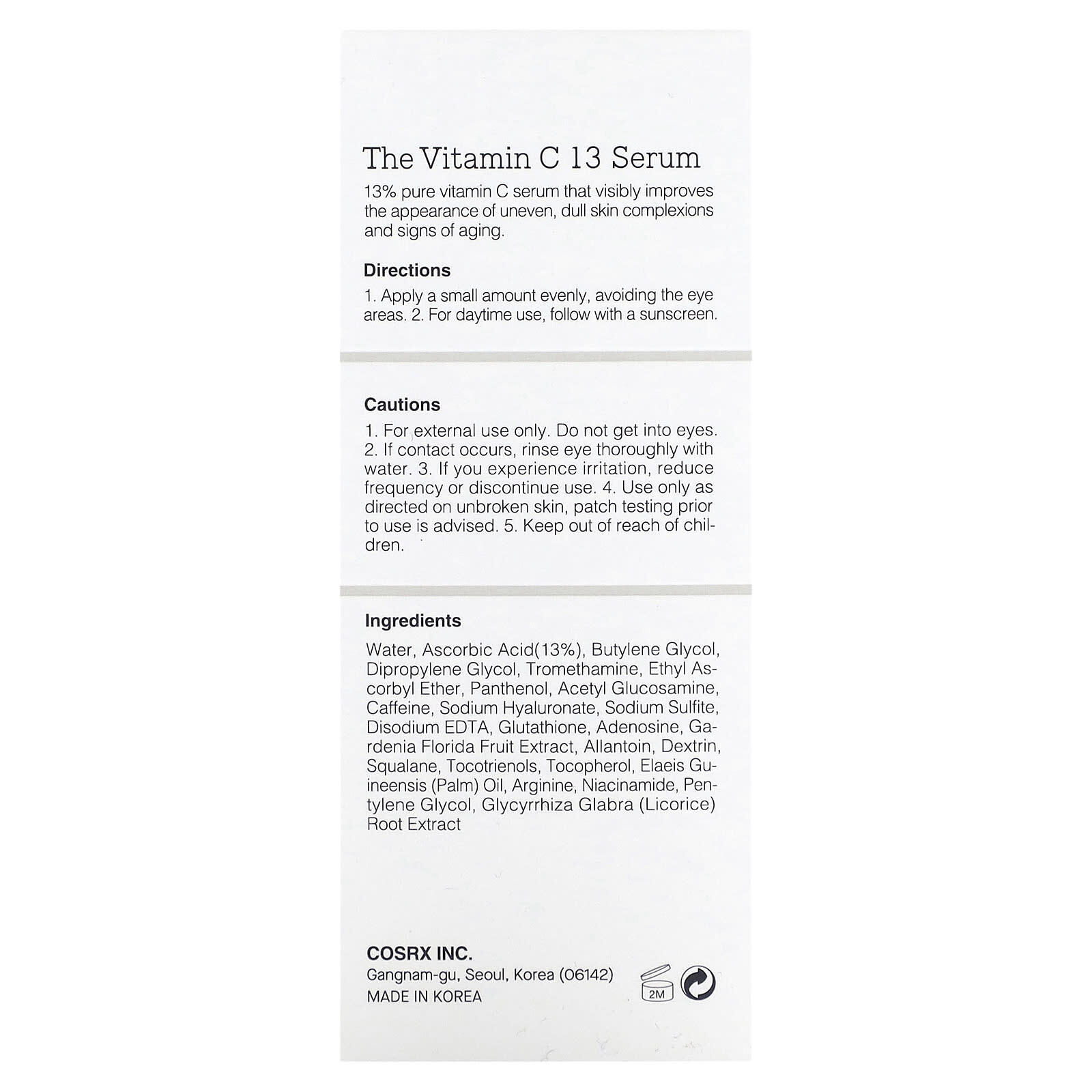 Вода, аскорбиновая кислота (13%), бутиленгликоль, дипропиленгликоль, трометамин, этиловый аскорбиловый эфир, пантенол, ацетилглюкозамин, кофеин, гиалуронат натрия, сульфит натрия, двунатриевая ЭДТК, глутатиона, аденозин, экстракт плодов гардении жасминовидной (Gardenia florida), аллантоин, декстрин, сквалан, токотриенолы, токоферол, пальмовое масло (Elaeis guineensis), аргинин, никотинамид, пентилен гликоль, экстракт корня солодки (Glycyrrhiza glabra).