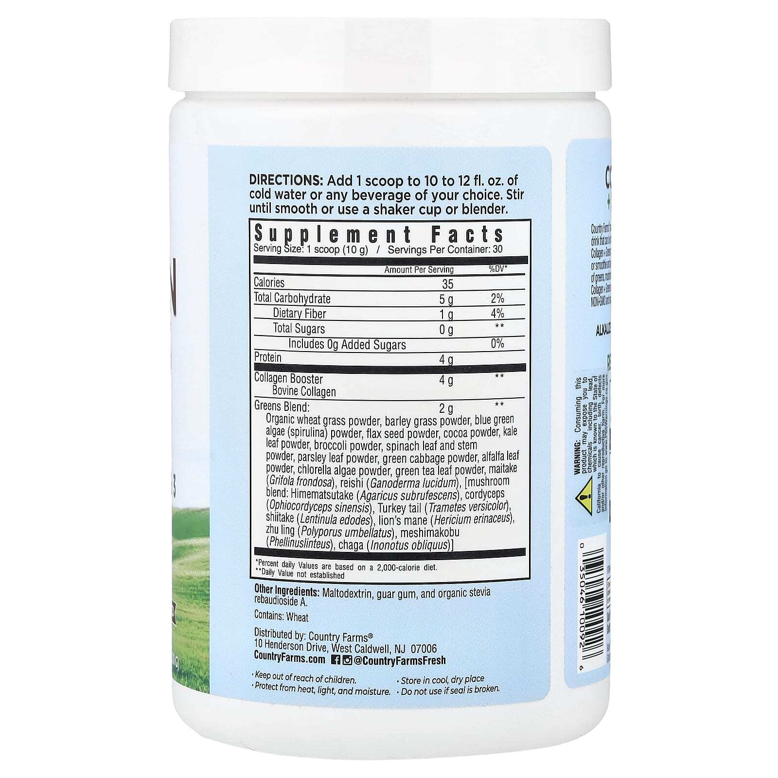 Country Farms® предлагает удобный бодрящий и питательный напиток, который можно включить в свой ежедневный рацион. Коллаген и зелень являются отличным дополнением для вашего любимого коктейля или смузи, а также простым способом восполнить питательные вещества с помощью ежедневной дозы зелени, грибов и коллагена типов 1 и 3. Универсальная питательная добавка с коллагеном и зеленью от Country Farms®, не содержит ГМО и готова к использованию.