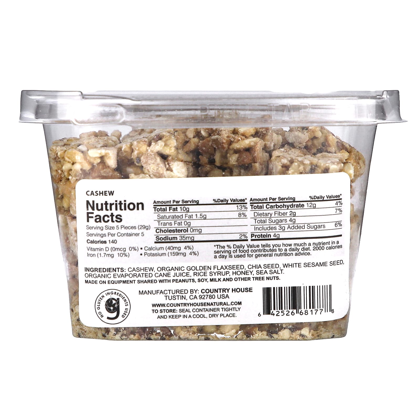 кешью, органическое золото льняного семени, семена чиа, семена белого кунжута, органический выпаренный сок тростника, рисовый сироп, мед, морская соль.