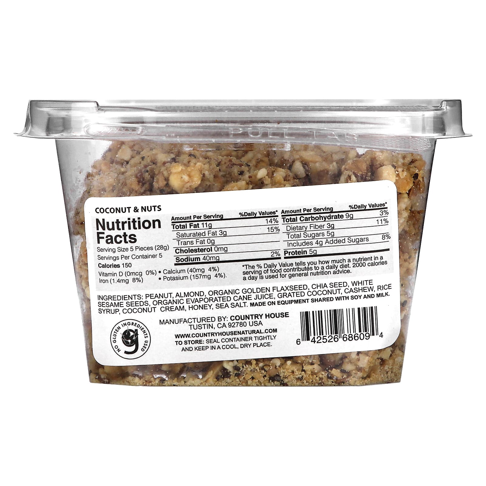 арахис, миндаль, органическое золото льняного семени, семена чиа, семена белого кунжута, органический выпаренный сок тростника, тертый кокос, кешью, рисовый сироп, кокос, сливки, мед, морская соль.