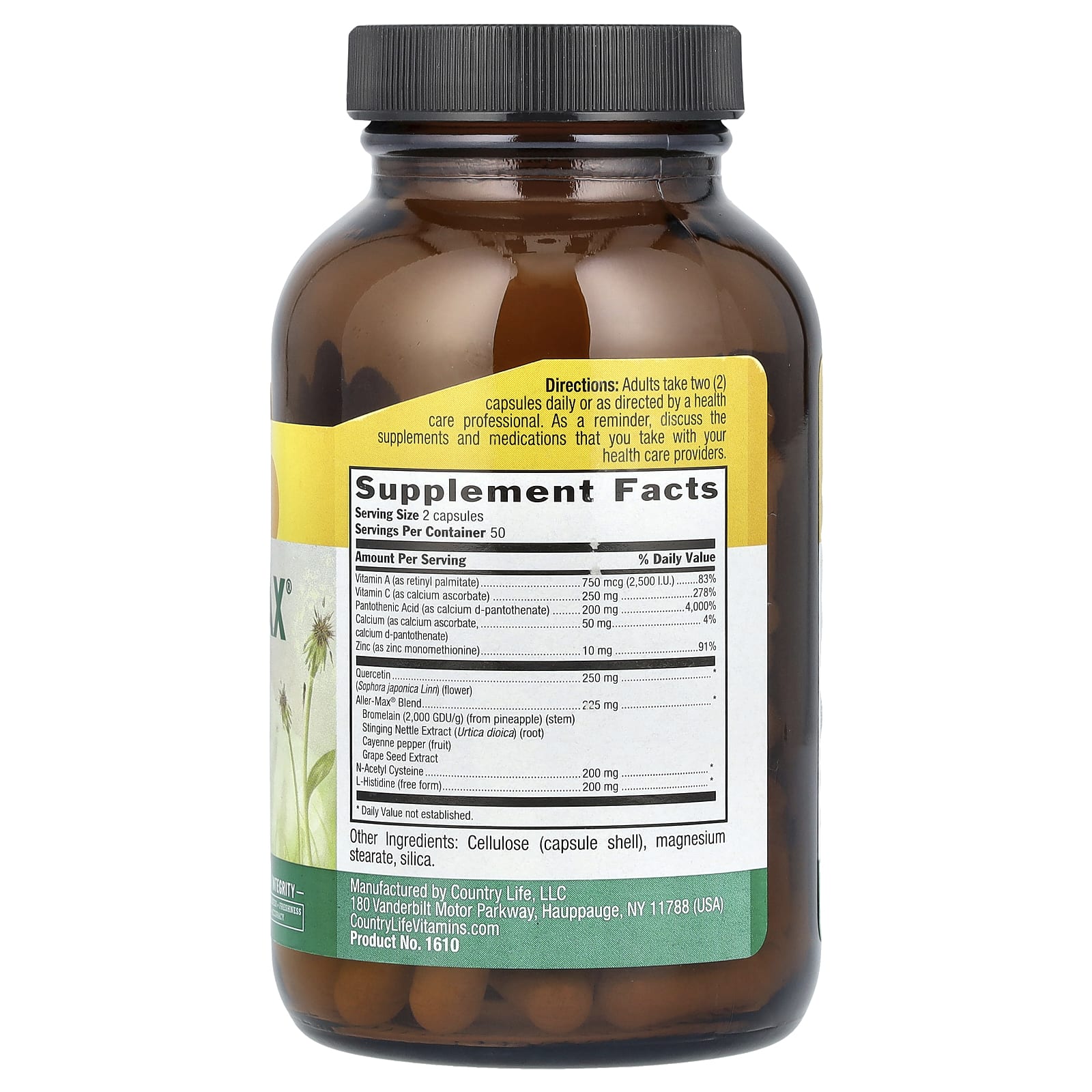 Aller-Max® от Country Life — это уникальный комплекс на основе ключевых ингредиентов кверцетина, бромелаина и витамина C. Кверцетин — это биофлавоноид природного происхождения (не цитрусовый), полученный из бутонов цветков. Бромелаин — это фермент, полученный из стебля ананаса. Aller-Max® также содержит витамин C вместе с такими травами, как крапива двудомная и кайенский перец.