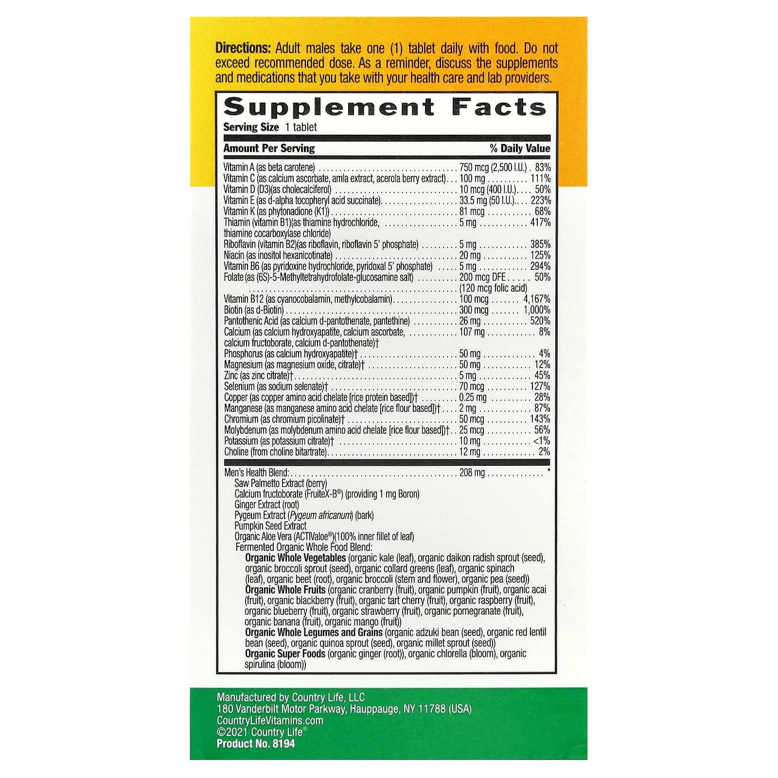 | Смесь для мужского здоровья: Экстракт серенои (ягода) Фруктоборат кальция (FruiteX-B®) (содержит 1 мг бора) Экстракт имбиря (корень) Экстракт коры африканской сливы (Pygeum africanum) Экстракт семян тыквы Органическое алоэ вера (ACTIValoe®) (100% внутренняя часть филе листа) смесь ферментированных органических цельных продуктов: органические цельные овощи (органическая кудрявая капуста (лист), органические ростки органической редьки дайтекона (семена), органические ростки брокколи (семена), органическая листовая капуста (лист), органический шпинат (лист), органическая свекла (корень), органическая брокколи (стебель и цветки ), органический горох (семена) органические цельные фрукты (органическая клюква (плод), органическая тыква (плод), органические плоды асаи, органическая голубика (плод), органическая клубника (плод), органический гранат (плод), органический банан (плод), органическое манго (плод ). Органические цельные бобовые и злаки (органические семена адзуки, семена органической красной чечевицы, ростки органического киноа (семена), ростки органического проса (семена)) Органические суперфуды (органический корень имбиря, органическая хлорелла (цветок), органическая спирулина (цветок)) Ликопин (из экстракта мякоти томатов) | 208 мг | * |