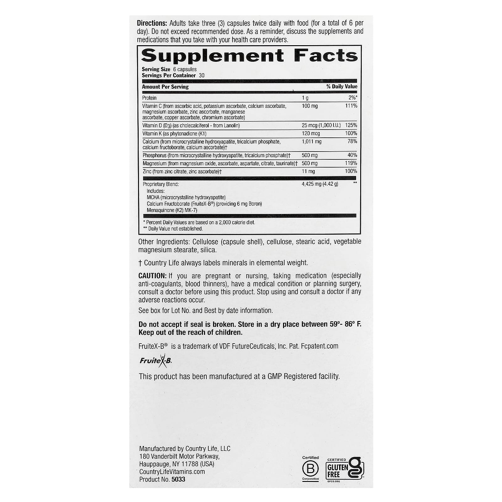 | Запатентованная смесь: Включает: МСНА (микрокристаллический гидроксиапатит) Фруктоборат кальция (FruiteX-B®) (обеспечивает 6 мг бора) Менахинон (K2) MK-7) | 4425 мг (4,42 г) | ** |