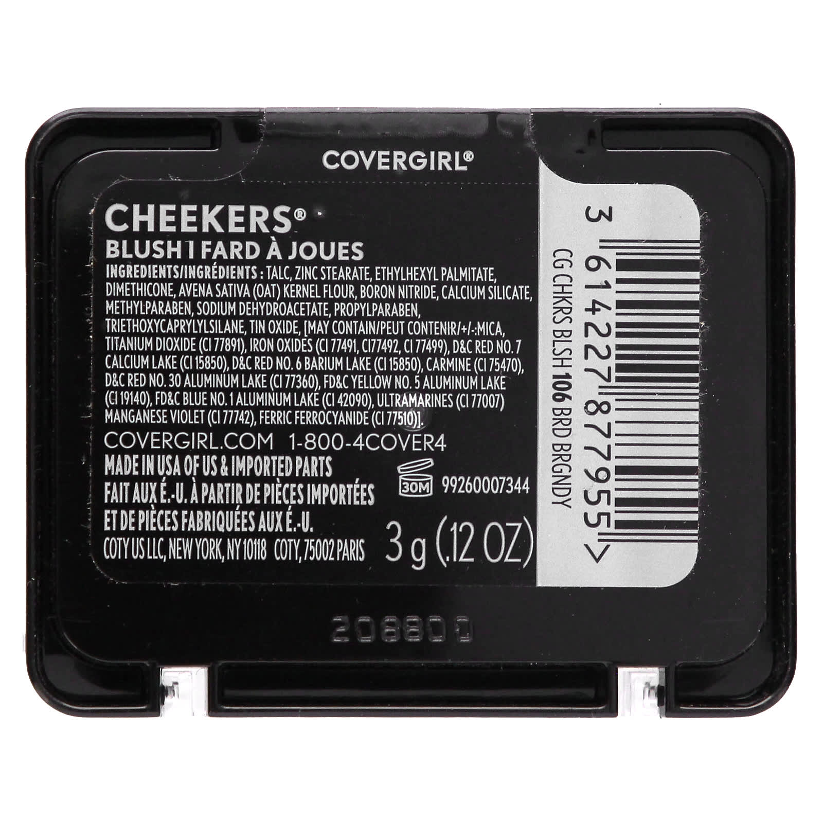 Тальк, стеарат цинка, этилгексил пальмитат, диметикон, мука из ядер овса (Avena sativa), нитрид бора, силикат кальция, метилпарабен, дегидроацетат натрия, пропилпарабен, триэтоксикаприлилсилан, оксид олова, [может содержать слюду, +/-: слюду, диоксид титана (CI 77891), оксиды железа (CI 77491, CI77492, CI 77499), краситель красный 7 D&C кальциевый лак (CI 15850), краситель красный 6 D&C бариевый лак (CI 15850), кармин (CI 75470), краситель красный D&C краситель алюминиевый 30 (CI 77360), краситель желтый 5 FD&C алюминиевый лак (CI 19140), краситель синий FD&C 1 алюминиевый лак (CI 42090), ультрамарины (CI 77007), краситель темно-фиолетовый (CI 77742), берлинскую лазурь (CI 77510)].