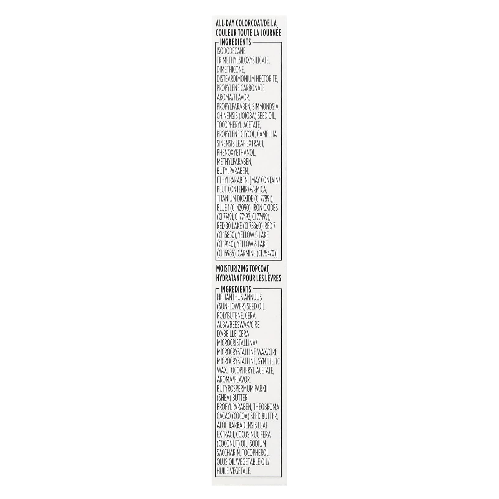 Увлажняющее верхнее покрытие: Подсолнечное масло (Helianthus annuus), полибутен, пчелиный воск, микрокристаллический воск, синтетический воск, токоферилацетат, ароматизатор, масло ши (Butyrospermum parkii), пропилпарабен, масло из зерен какао (Theobroma cacao), экстракт листьев алоэ вера (Aloe barbadensis), кокосовое масло (Cocos nucifera), сахарин натрия, токоферол, растительное масло.