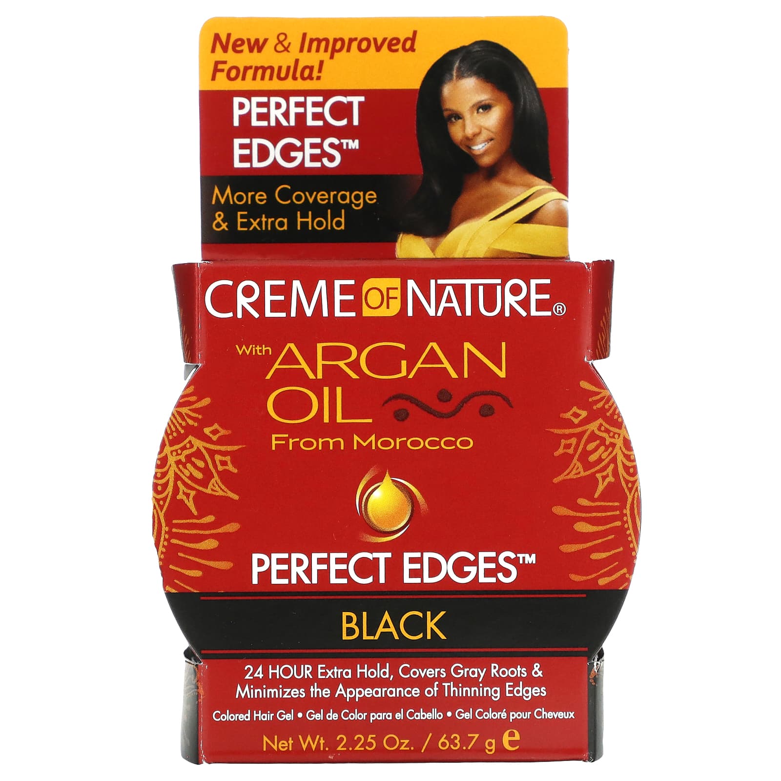 Гель с черными краями Perfect Edges с аргановым маслом обеспечивает дополнительную стойкость в течение 24 часов, увлажняет и блестит, скрывая седину у корней и сводя к минимуму появление истонченных краев.